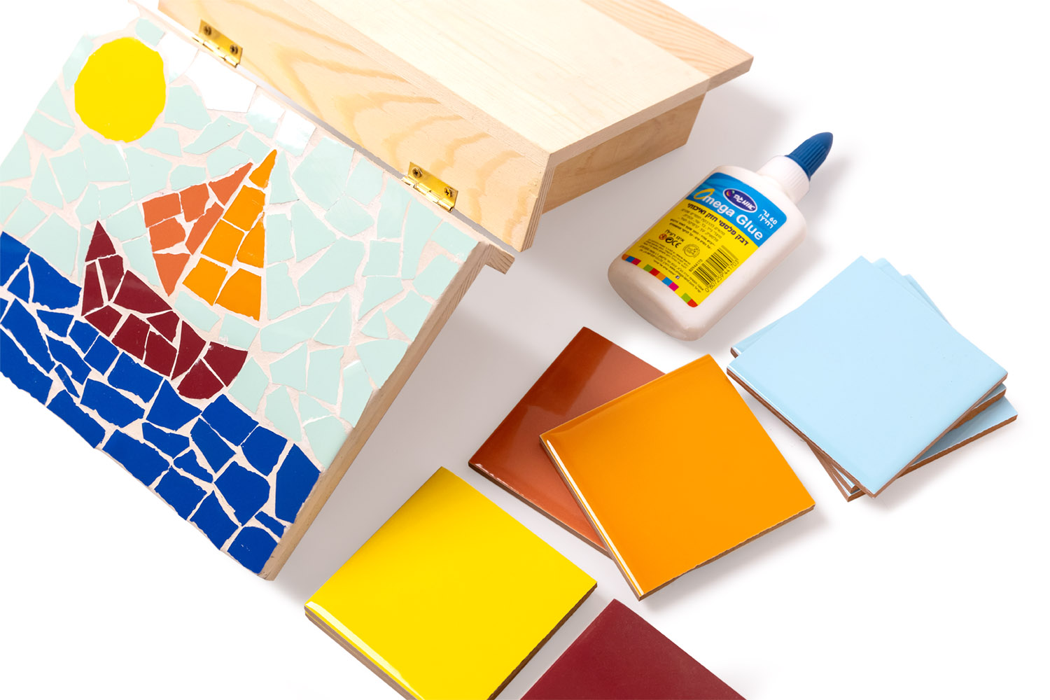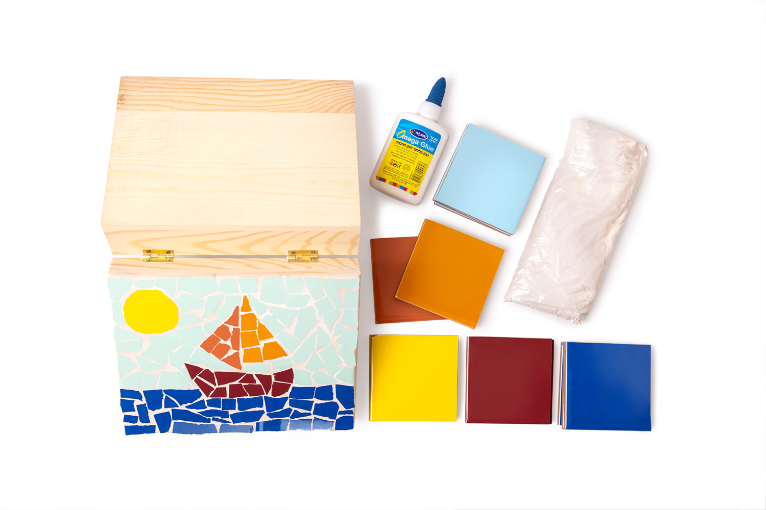 Get together with friends and family, or take a quiet evening alone and unleash your creative spirit with a D-I-Y Mosaic kit featuring a happy, colorful boat sailing on the blue sea on a hot summer day.