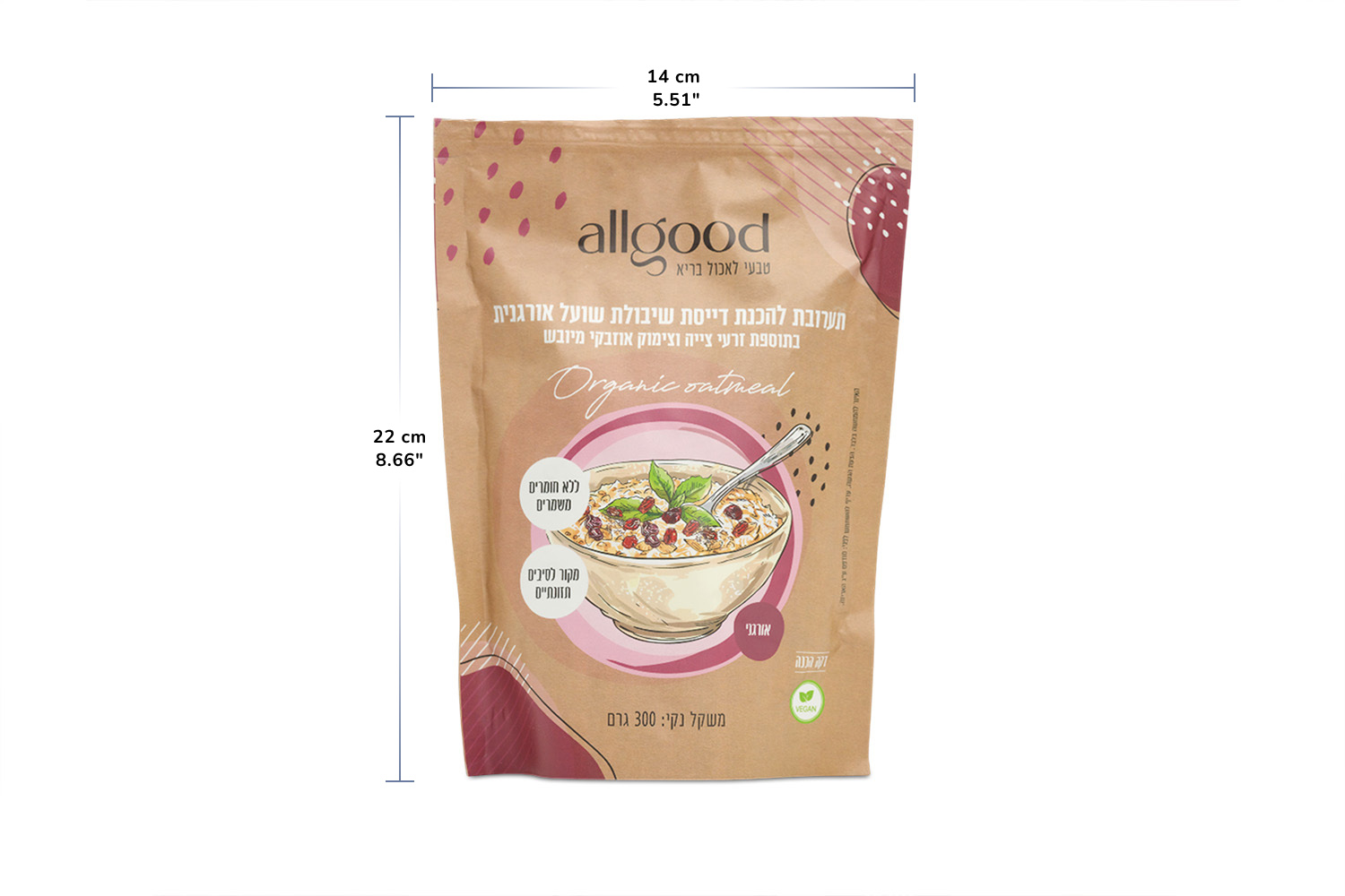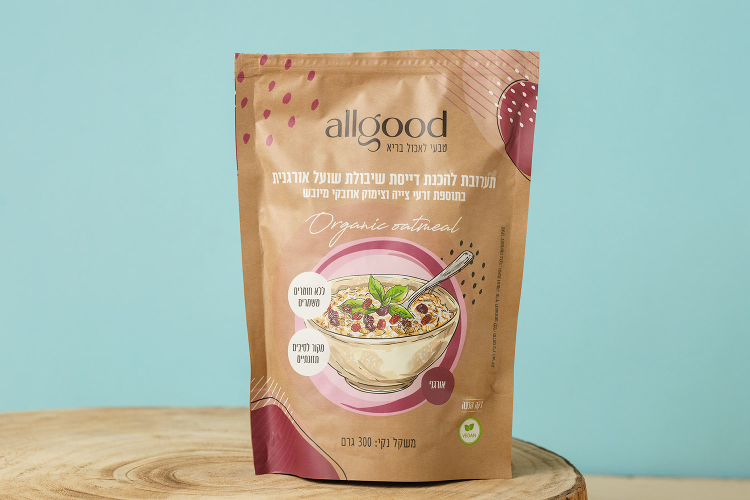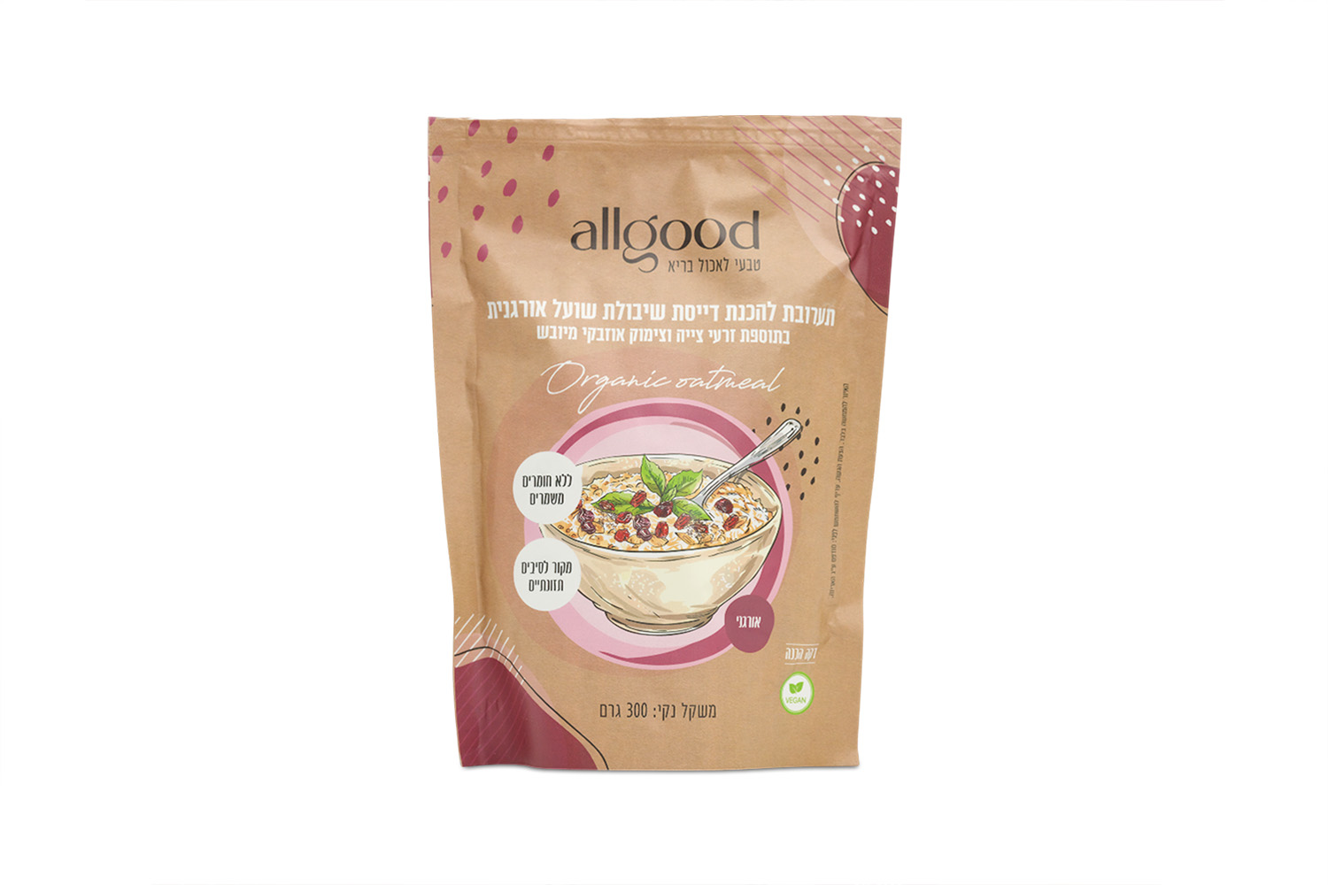 The product contains no preservatives and is suitable for vegan diets. It is designed for quick preparation and works well as a warm porridge or as a base for fruit, nuts, and natural sweeteners. It reflects Allgood’s commitment to organic ingredients and practical nutrition in modern Israeli kitchens.