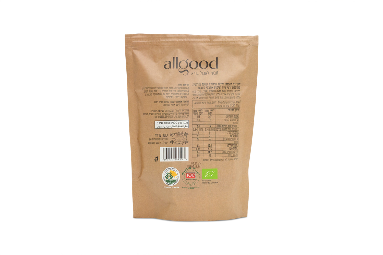 By combining organic certification, functional ingredients, and Israeli-based production, Allgood contributes to the local food ecosystem while serving customers seeking transparent, ingredient focused pantry options.