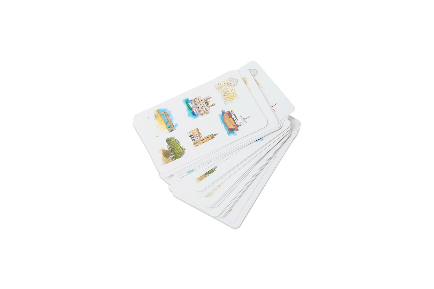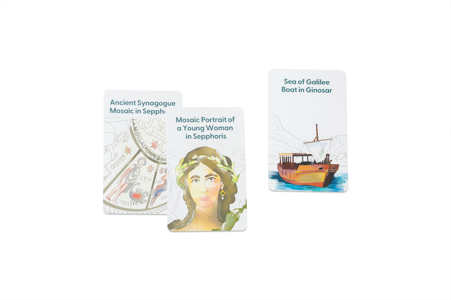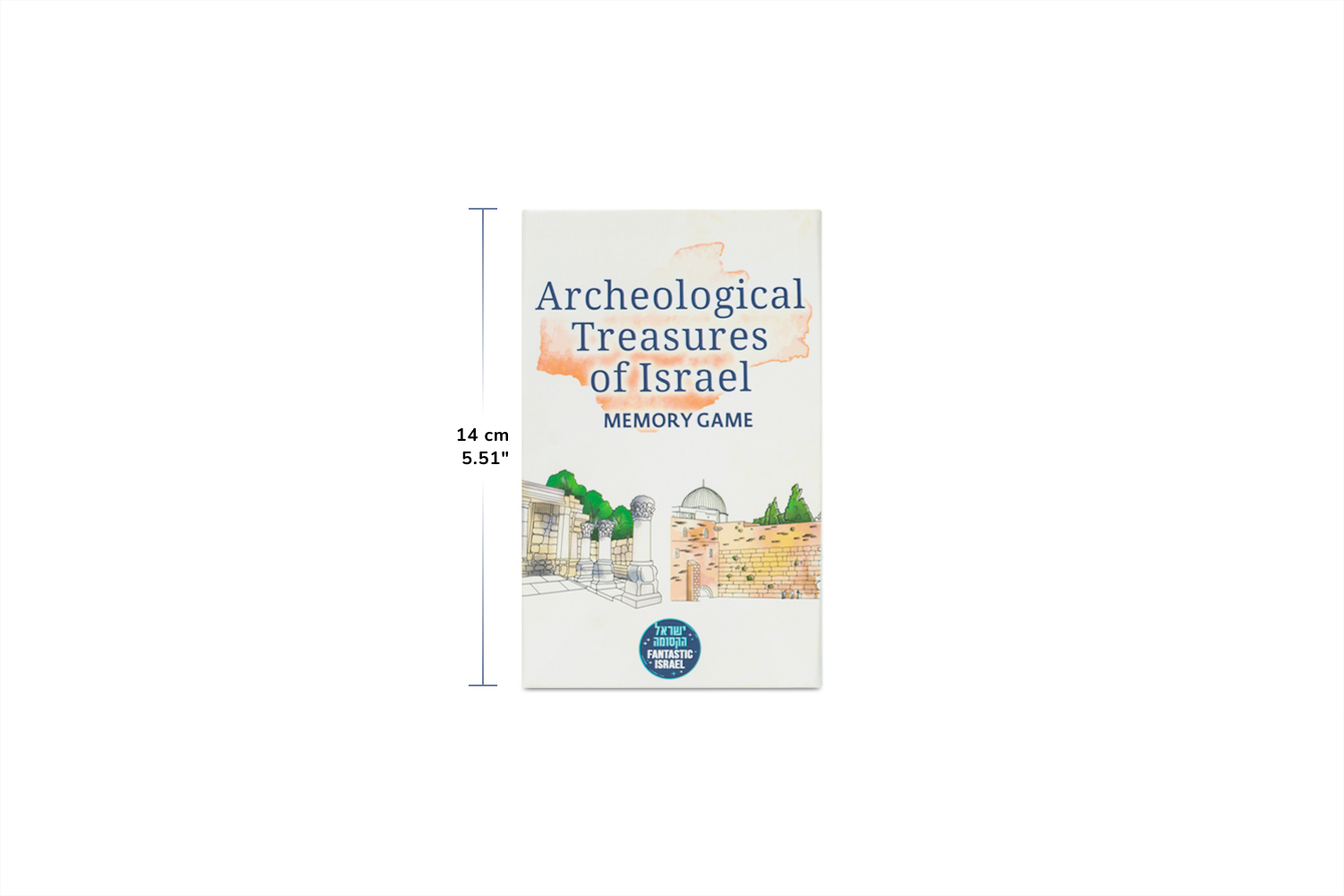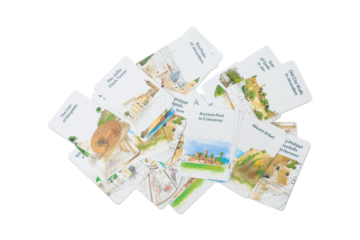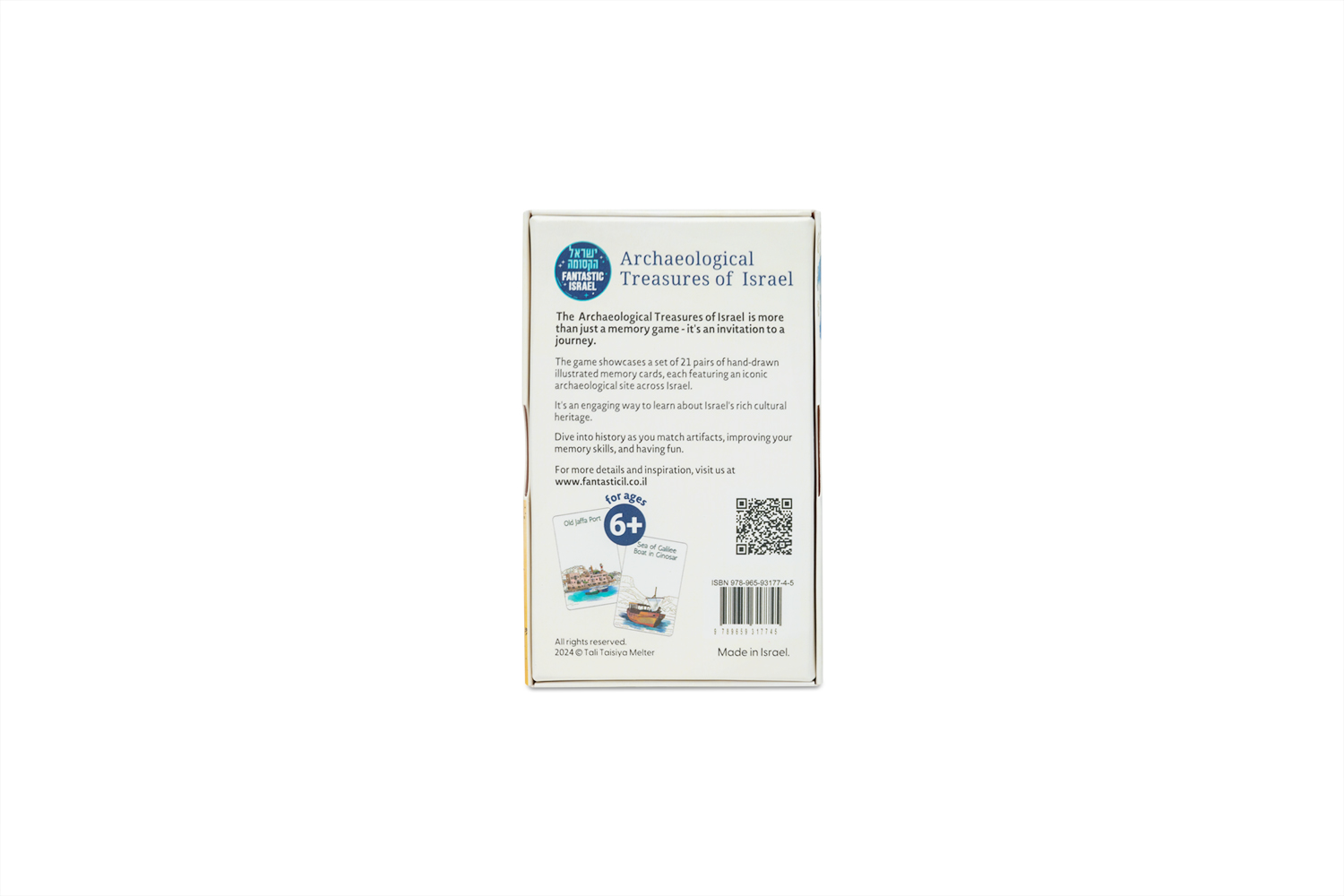 The game includes twenty-one matching pairs of illustrated cards, each focused on a specific archaeological site in Israel. Locations such as the Old City walls of Jerusalem, the ancient port of Caesarea, the Sea of Galilee boat discovered in Ginosar, mosaics from Sepphoris, and landmarks from Jaffa appear as visual anchors. Each card pairs an illustration with the site’s name in English, making the experience accessible while staying grounded in place. The artwork favors architectural detail and recognizable forms, helping players connect images to real locations they may have visited, studied, or encountered through Israeli history.