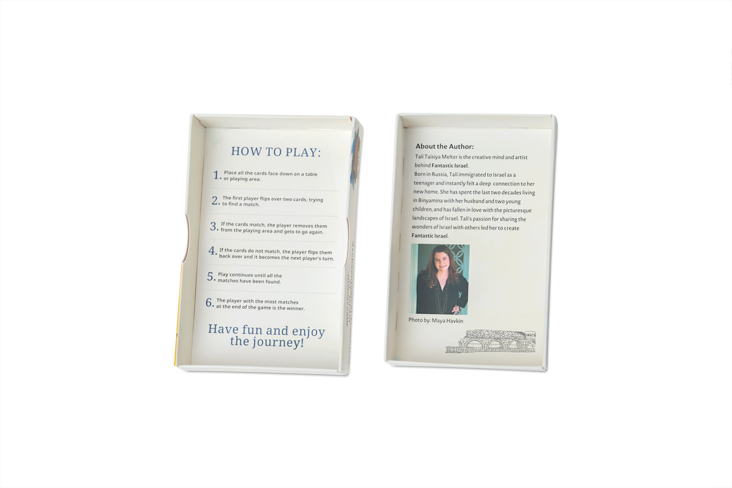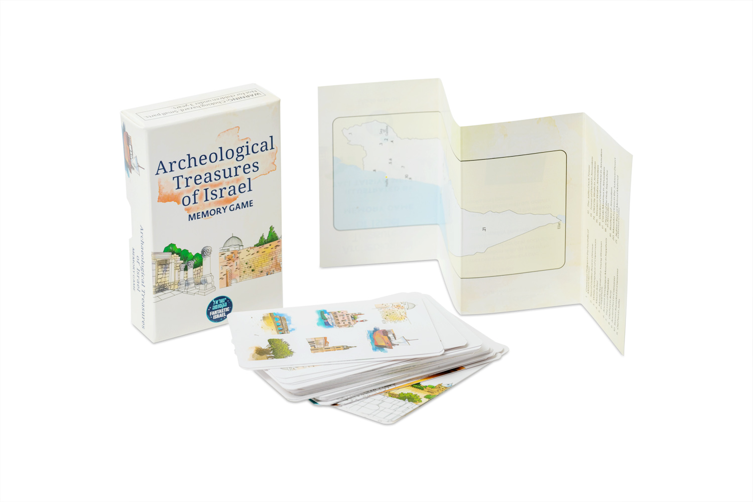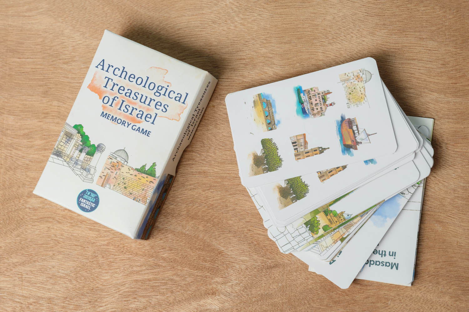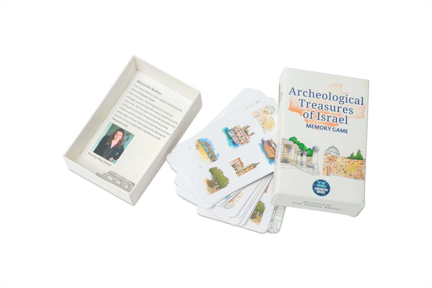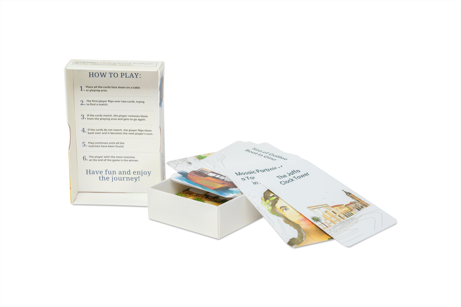 Designed for repeated use, the cards are sturdy and smooth, sized comfortably for children and adults. Gameplay follows the classic memory format, allowing the focus to remain on observation, recall, and discussion. As matches are made, players often pause to talk about the sites themselves, turning the game into a natural entry point for conversation about archaeology, geography, and daily life in Israel across different eras.