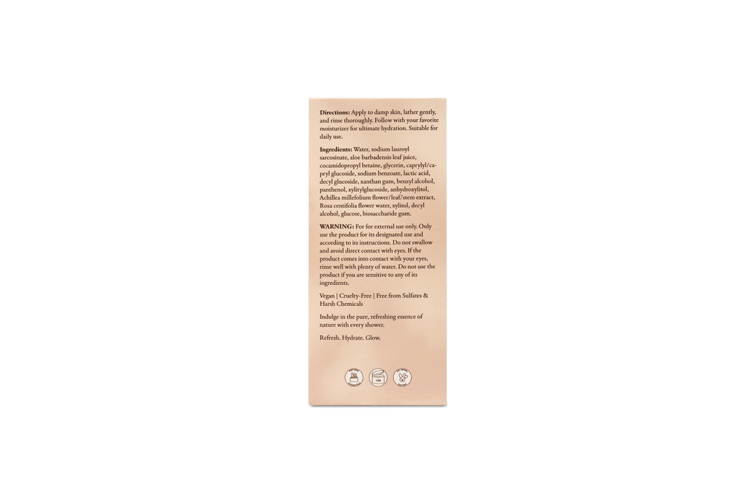 Water, sodium lauroyl sarcosinate, aloe barbadensis leaf juice, cocamidopropyl betaine, glycerin, caprylyl/capryl glucoside, sodium benzoate, lactic acid, decyl glucoside, xanthan gum, benzyl alcohol, panthenol, xylitylglucoside, anhydroxylitol, Achillea millefolium flower/leaf/stem extract, Rosa centifolia flower water, xylitol, decyl alcohol, glucose, biosaccharide gum.