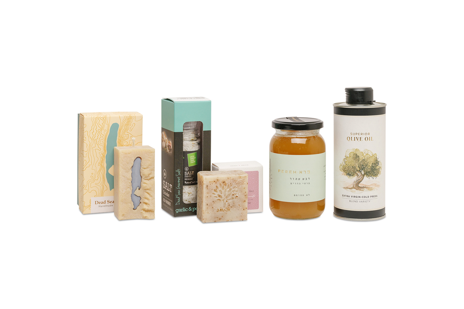 This collection of five authentic products offers a gentle introduction to Israel — its flavors, its textures, and the care of those who steward the Holy Land. Each item in this set is rooted in a different corner of the land: the Dead Sea, the Galilee, the Judean Hills, and the workshops of Jerusalem.