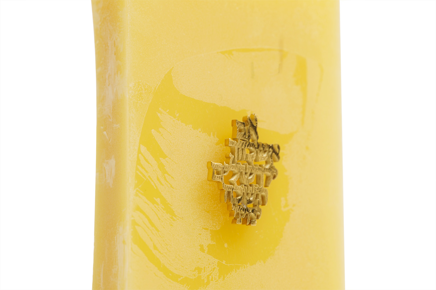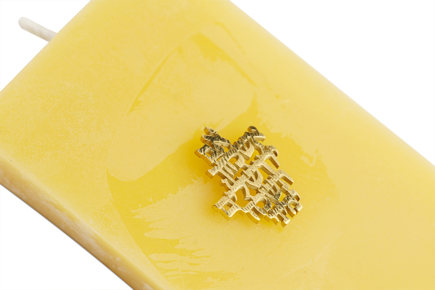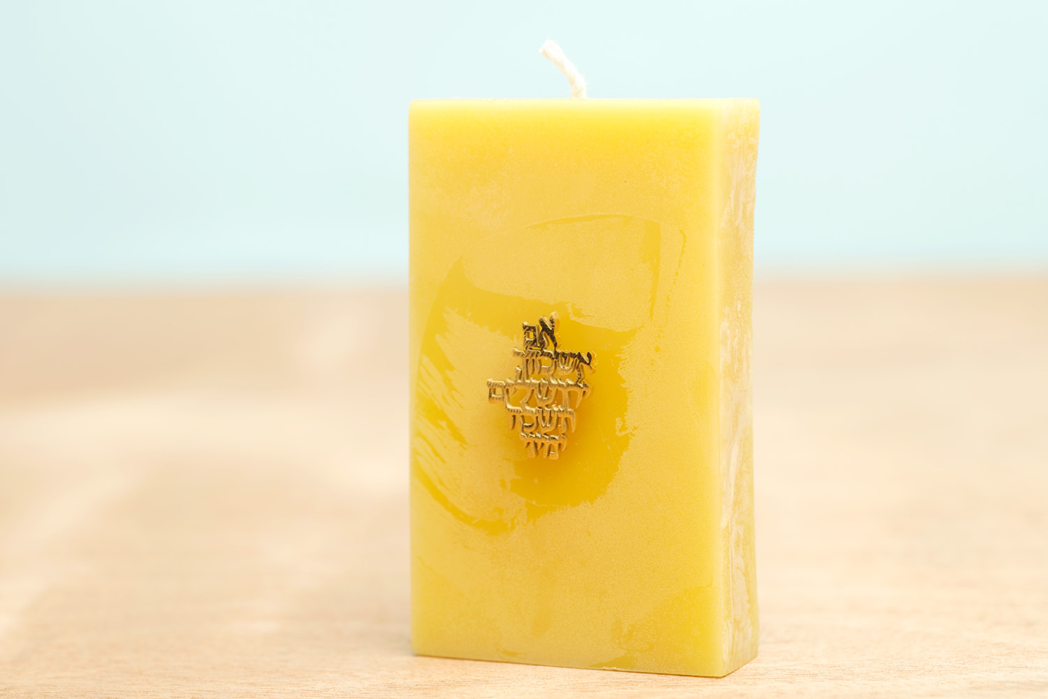 At the center of the candle, the Hebrew verse אם אשכחך ירושלים תשכח ימיני is formed directly into the wax. The text reads, “If I forget you, Jerusalem, let my right hand forget its skill” (Psalm 137:5). The lettering rises clearly from the surface and remains legible as part of the candle itself. As the candle burns, the raised text softens into the surrounding wax.