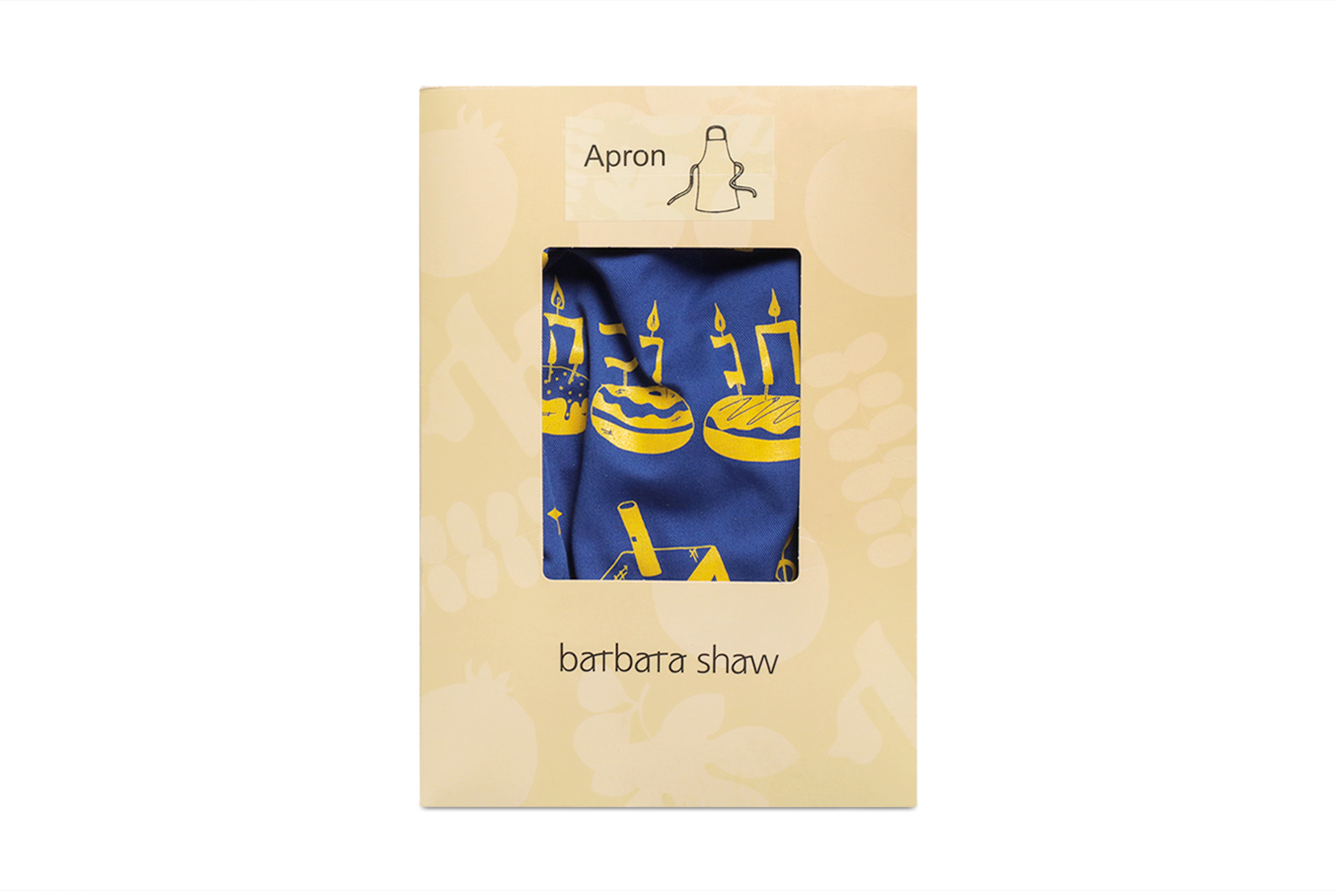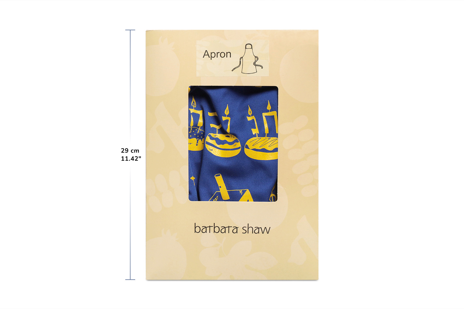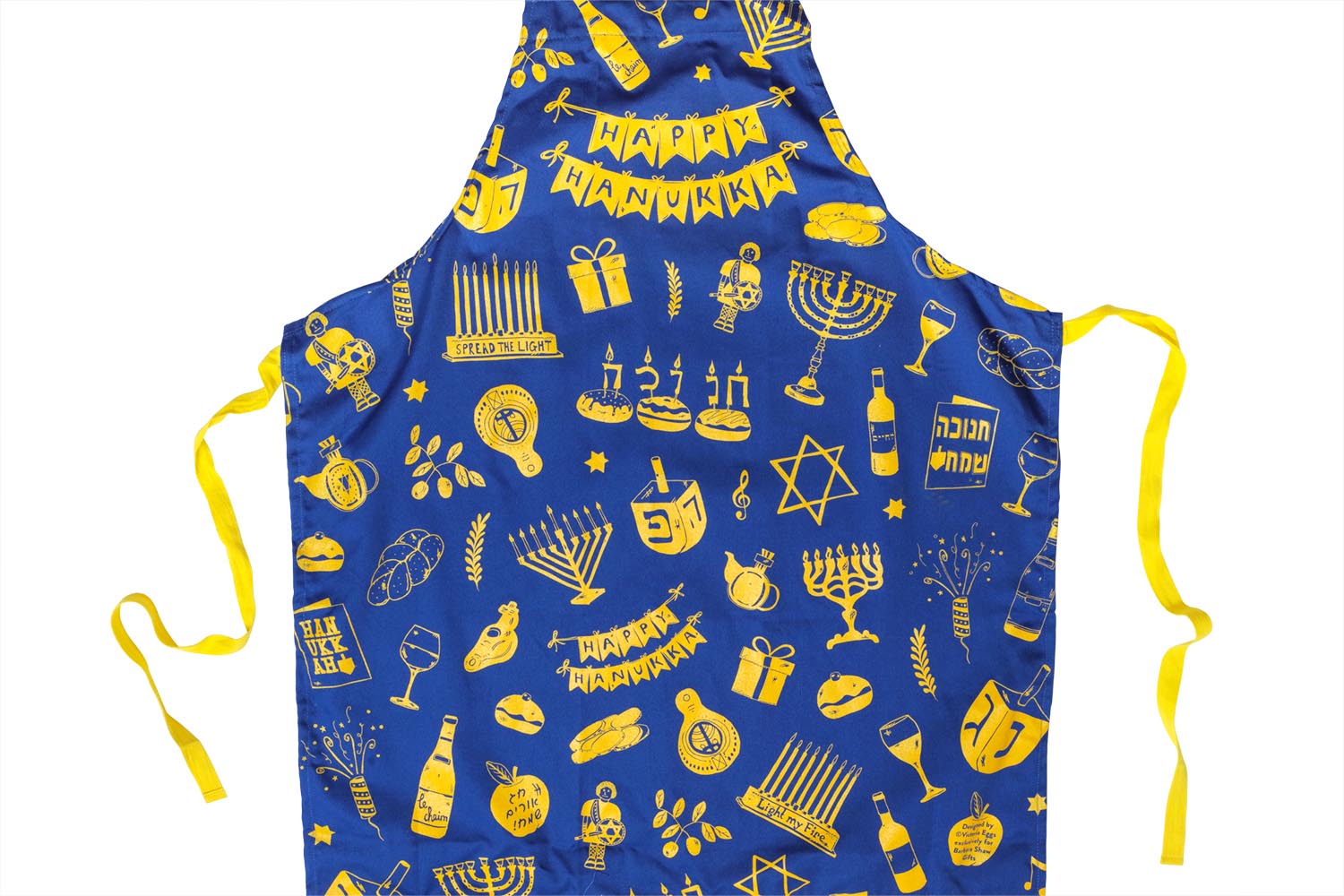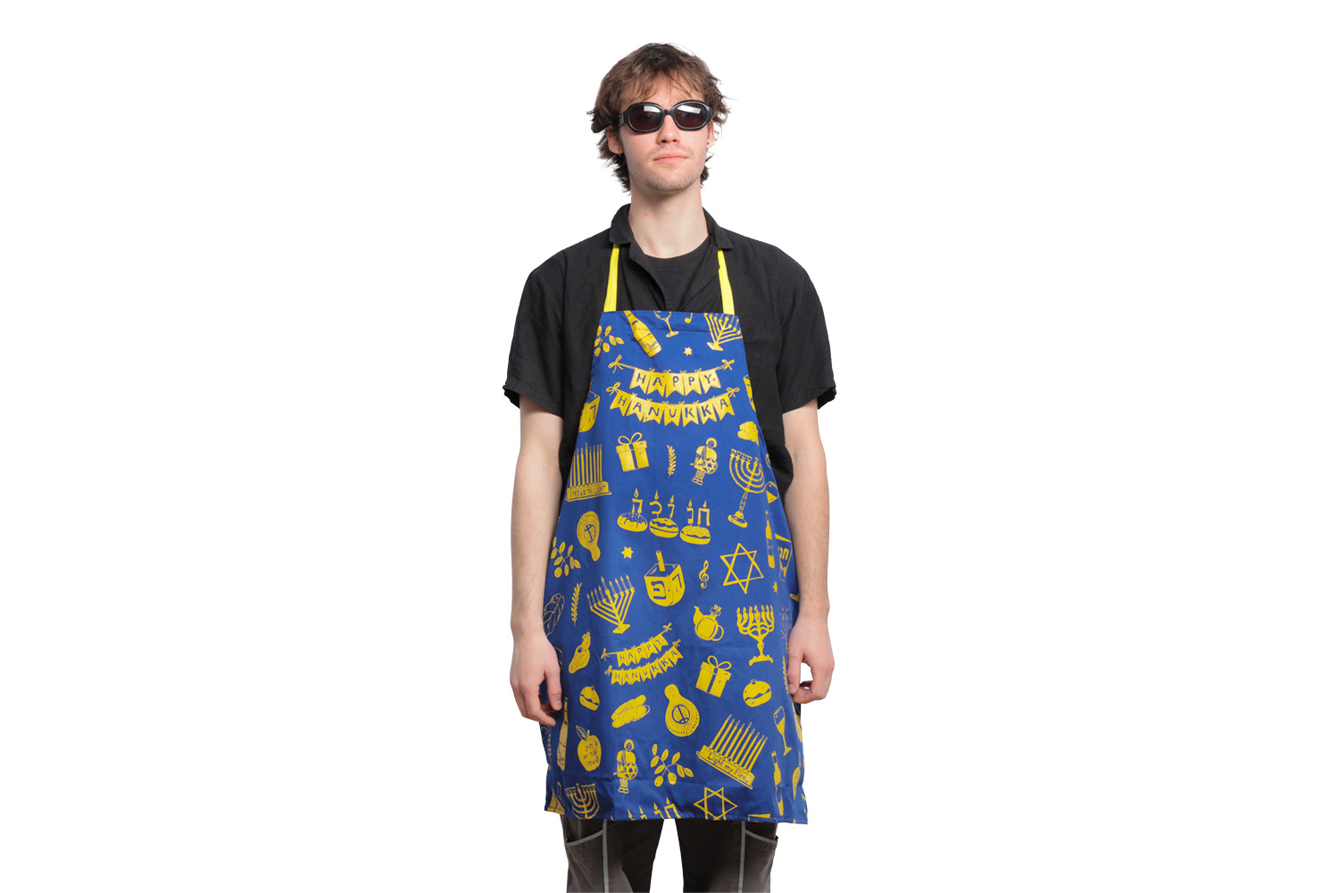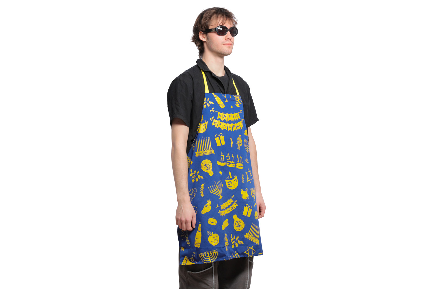 The design taps into the small, familiar moments of the holiday: lighting candles as something simmers on the stove, frying latkes while oil pops, setting out sufganiyot as guests arrive. This is the kind of apron that becomes part of those rituals year after year, pulled out before the first candle is lit.