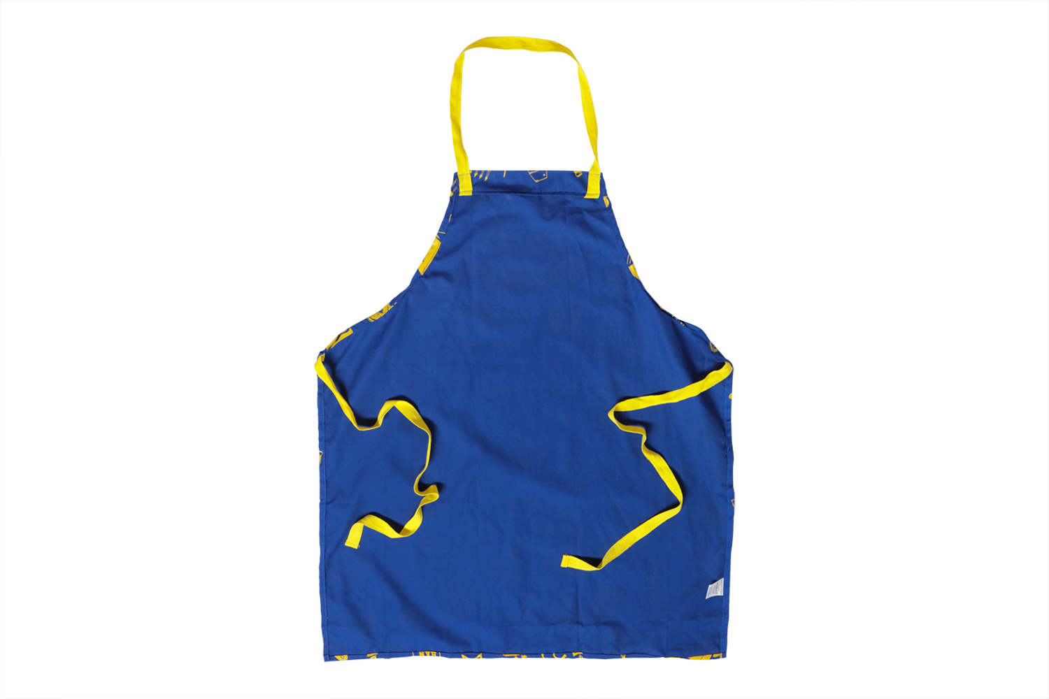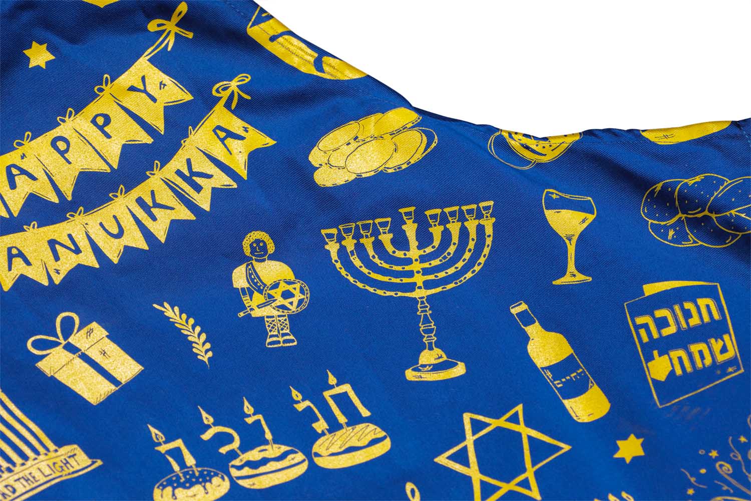 This apron feels like Hanukkah spread out across the kitchen table. Set against a deep blue background, the fabric is covered in warm golden illustrations—menorahs, dreidels, candles, wine bottles, olive branches, challah, and the word “Hanukkah” woven playfully into the pattern. It’s festive without being loud, rich in detail without feeling busy, and instantly recognizable as a holiday piece meant to be used, not just displayed.