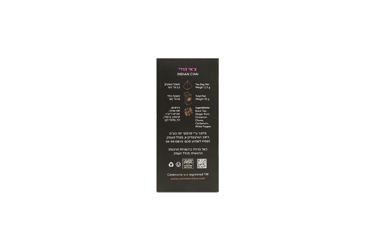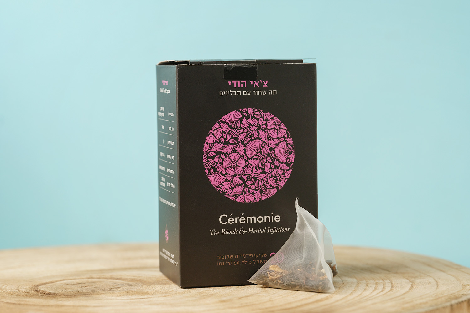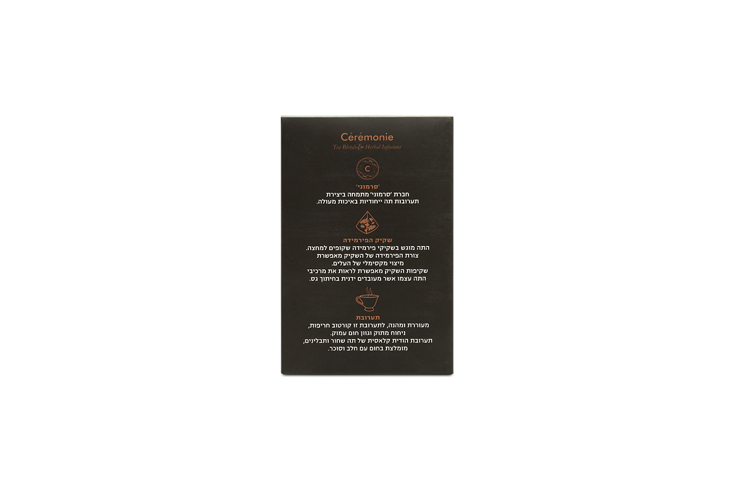 Ceremonie Tea is known throughout Israel for elevating everyday tea into a refined ritual. From their facility in Migdal HaEmek, they source premium whole leaf teas and fresh spices and pack each blend in elegant, eco-friendly mesh sachets that allow the leaves and spices to fully bloom in your cup. Every box reflects their mission: to bring boutique, small batch tea craftsmanship to tea lovers around the world, with flavor purity and visual beauty in every steep.