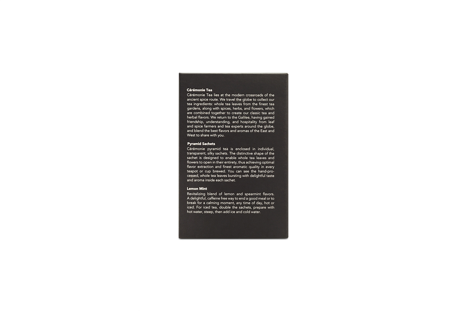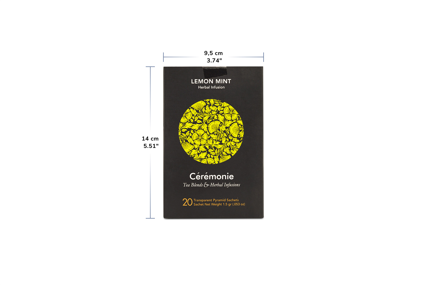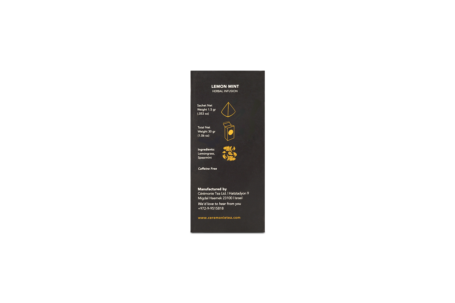 Refreshing, bright, and naturally calming, this Lemon Mint Herbal Infusion from Ceremonie Tea in Israel brings together the soothing citrus of lemongrass with the cool lift of spearmint. Each sachet contains 1.5 g (0.053 oz) of whole-cut botanicals that brew into a light bodied, aromatic cup that’s clean, uplifting, and caffeine free. The infusion delivers a balanced blend of gentle lemon notes and fresh mint – an ideal blend for relaxation, digestion, or a refreshing break at any time of day. Lemongrass and spearmint are traditionally enjoyed for their calming qualities that support digestion, with lemongrass offering gentle citrus ease and spearmint providing a refreshing clarity that helps settle and uplift the body.