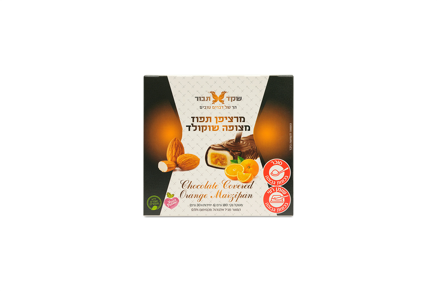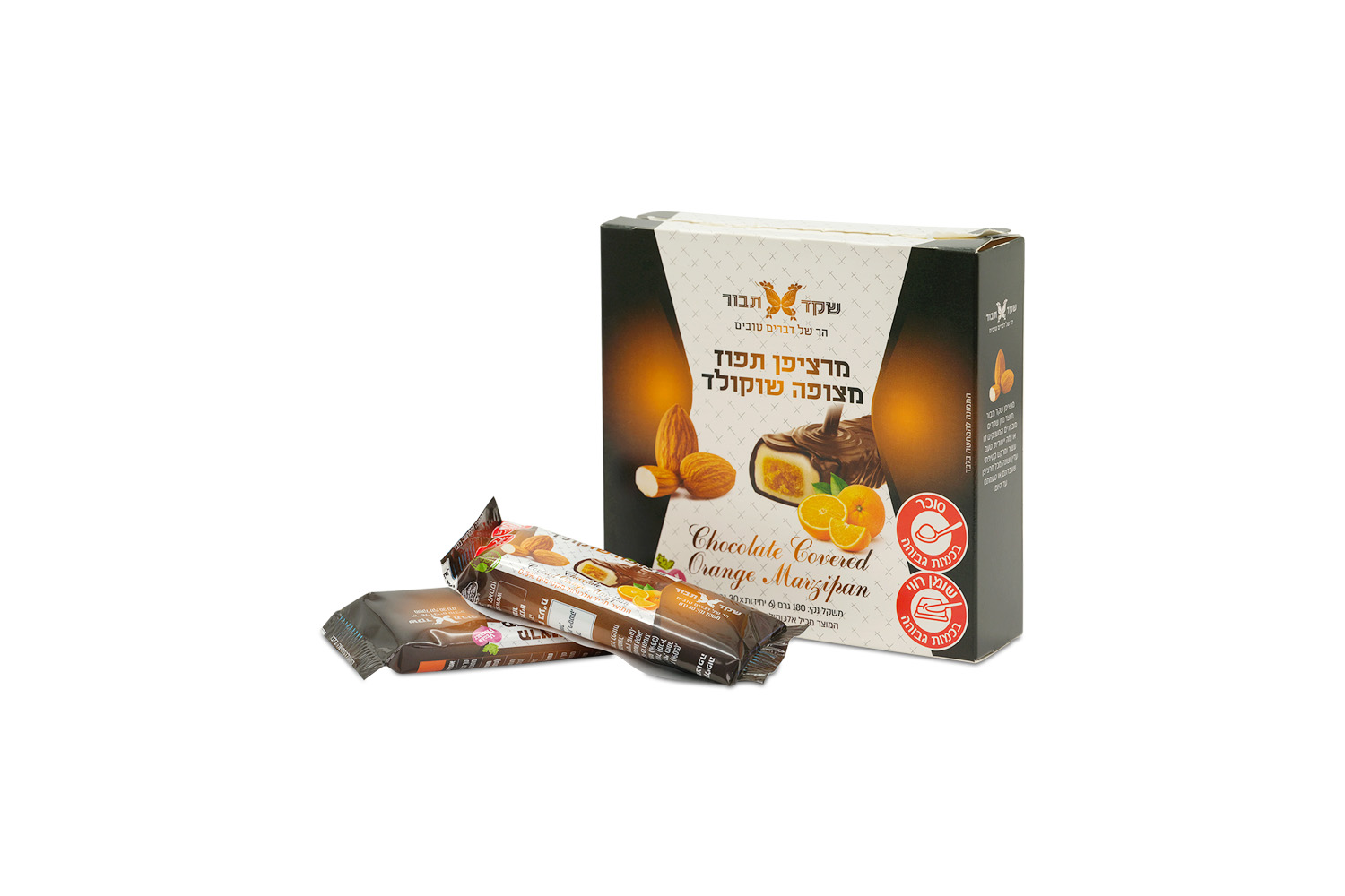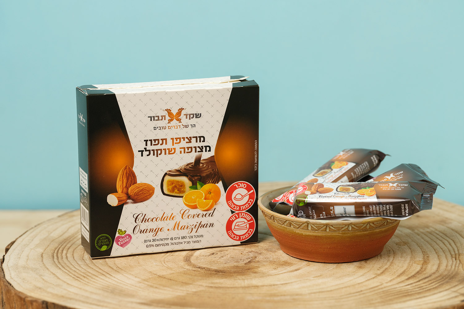 Each box holds six individually wrapped bars that are coated in smooth chocolate that softens on the tongue and reveals the tender marzipan beneath. Every step is carried out in small batches in the Shaked Tavor workshop, where the family still measures, blends, and tastes with the same care used when the first recipes were created. Their work is personal – an extension of the orchards they nurture and the traditions they preserve. When you enjoy one of these bars with coffee, offer them to guests, or savor them slowly after dinner, you’re experiencing the craft of a family whose livelihood depends on the support of people who choose foods that are shaped with integrity and the sacred spirit of the Holy Land. It’s a confection infused with citrus, chocolate, and the spirit of a producer committed to the land of Israel.