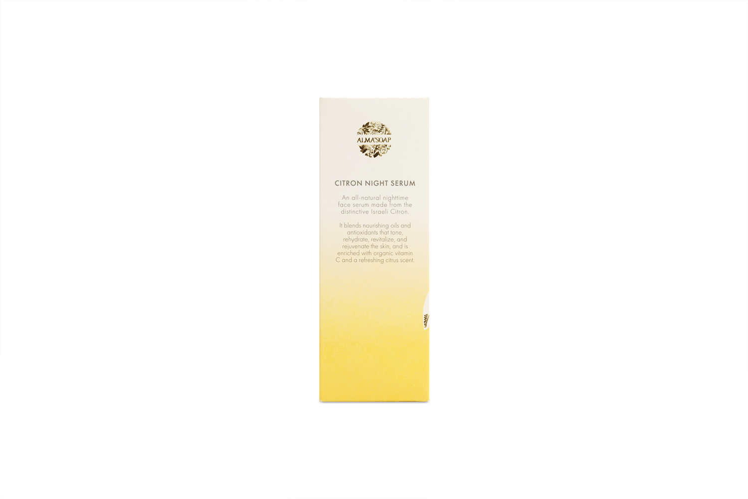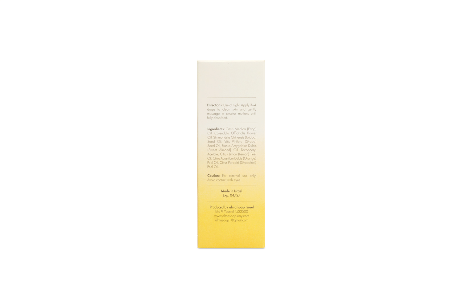 This nighttime facial serum centers around the Israeli citron, the fragrant citrus fruit known in Hebrew as the etrog. Its fresh, bright aroma gives the serum its character, while nourishing oils absorb into the skin overnight. The blend was designed to support the skin’s natural renewal during rest, leaving the face feeling refreshed by morning. The citrus notes are light and clean, and the texture of the oil is smooth and easily absorbed, and is suitable for a simple evening skincare routine.