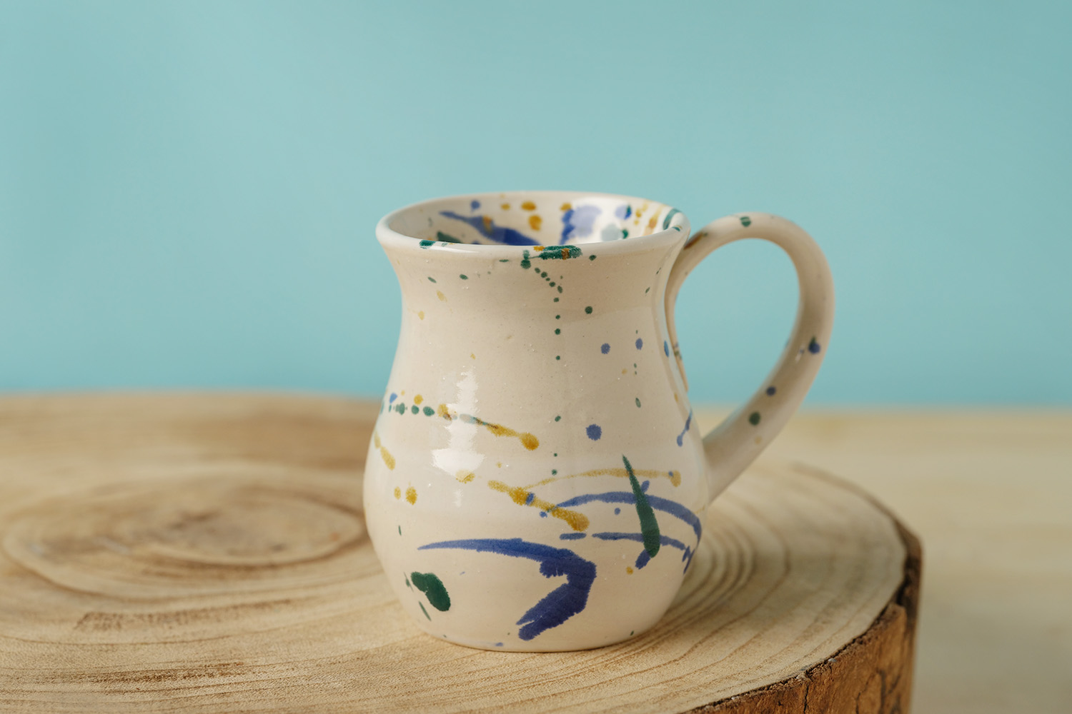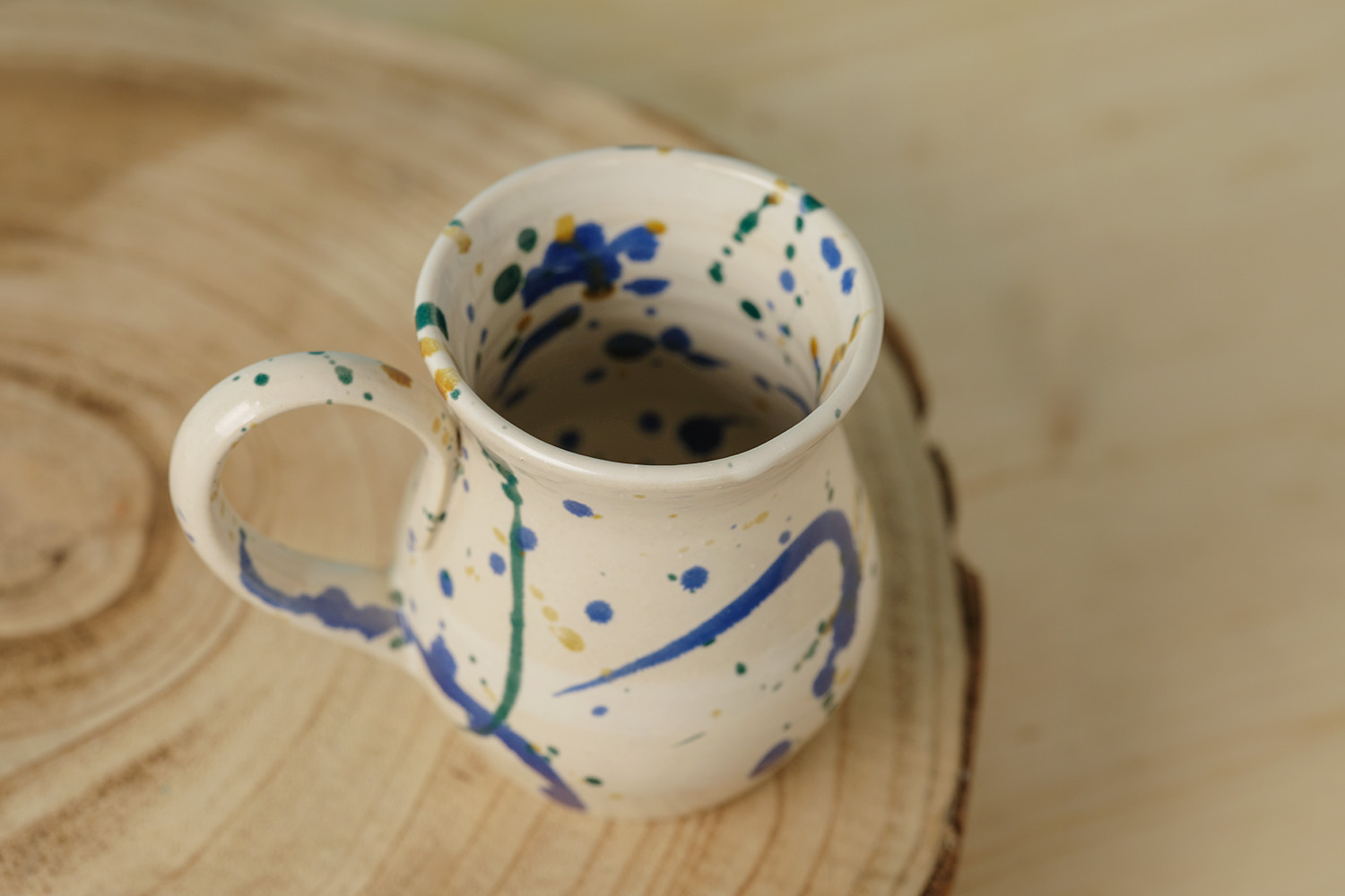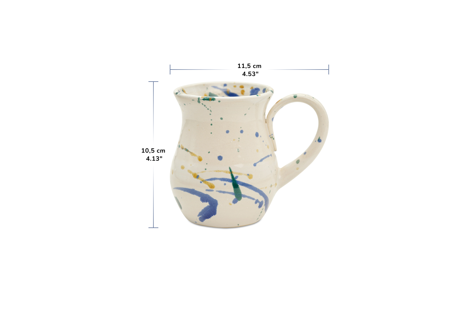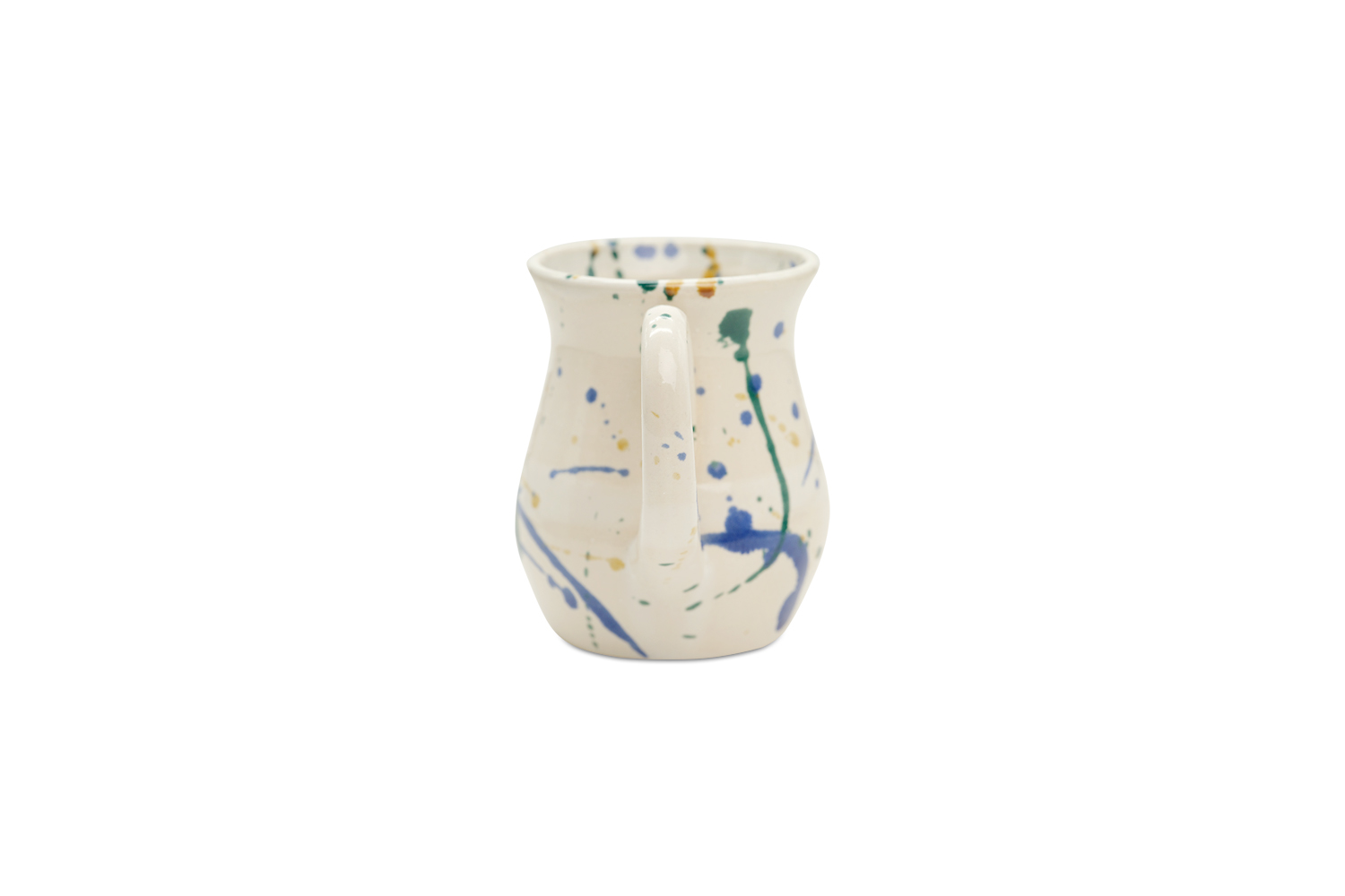 Studio Botz, an artisan pottery studio based in Israel, creates each piece by hand using methods passed down through generations of ceramic craftsmanship. This mug reflects the spontaneity and rhythm of work at the wheel, where each brushstroke of color becomes part of the clay’s surface rather than decoration laid on top.
