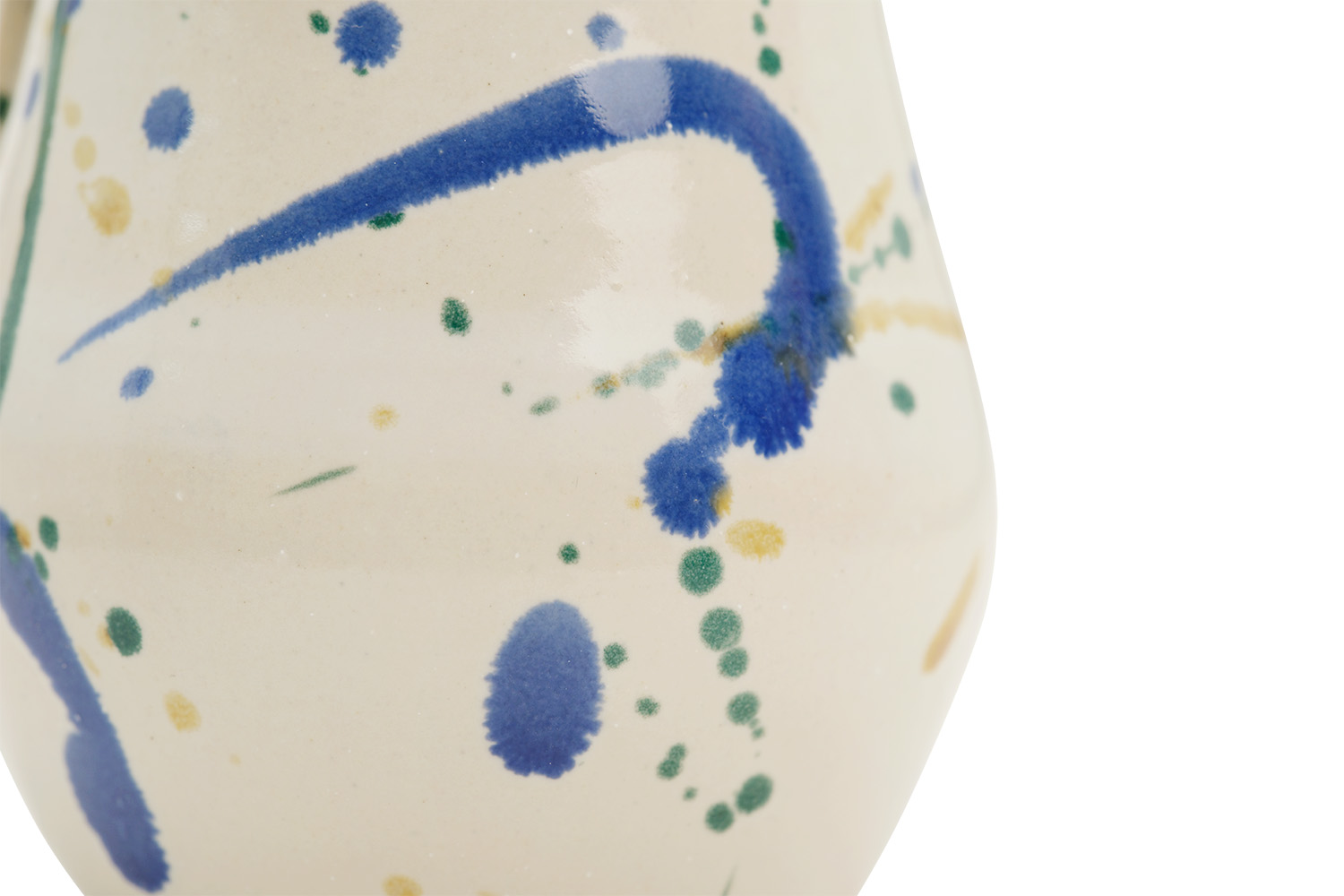 The curved shape rests naturally in the hand, with flowing marks of blue, green, and ochre glaze over a warm cream body. These patterns echo the shifting tones of the Israeli landscape: the deep blues of the Mediterranean, the green of fields of the North after rain, and the muted gold of desert earth under sunlight. All whimsically painted in the spirit of unbreakable Israeli joy.