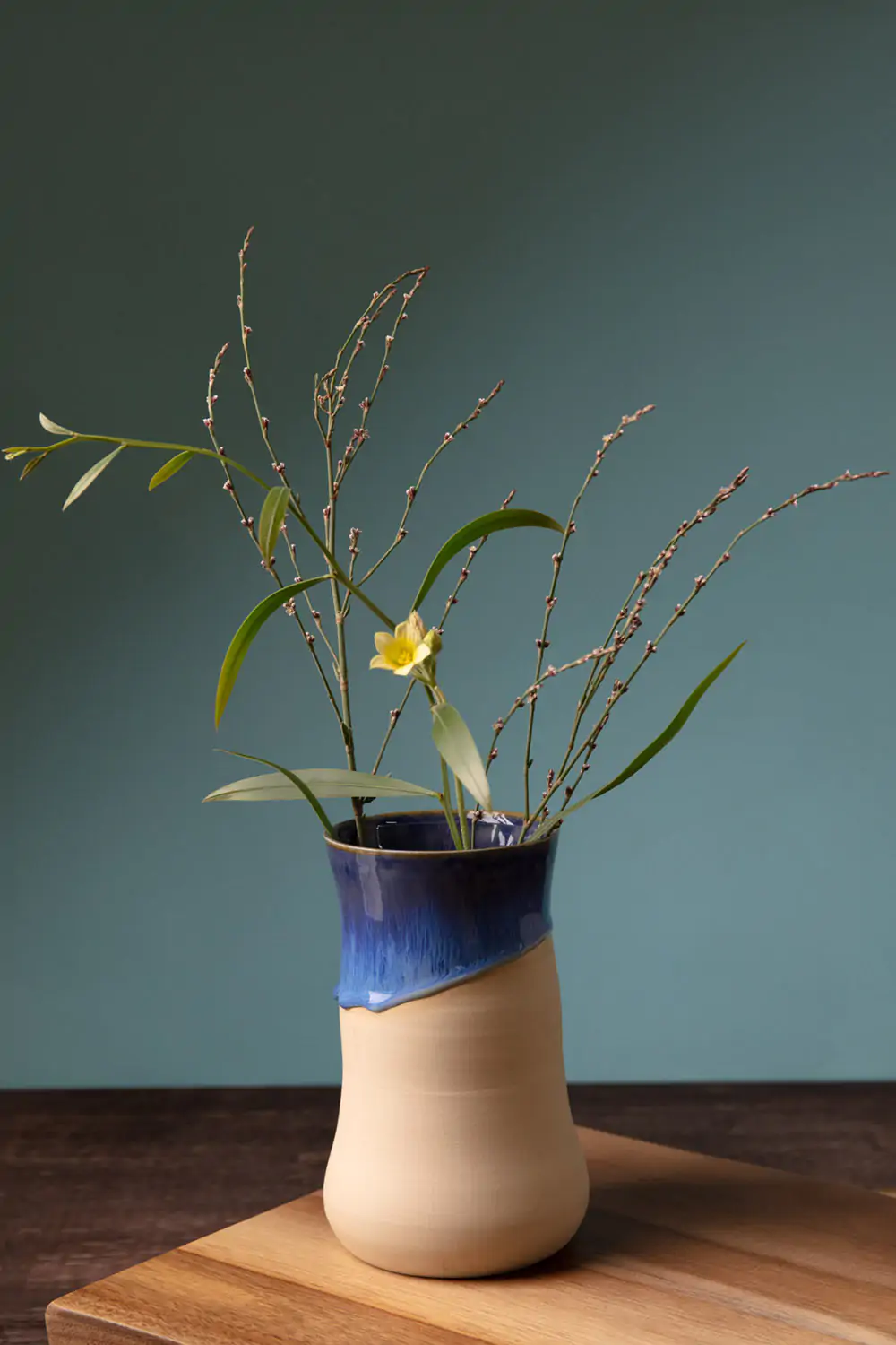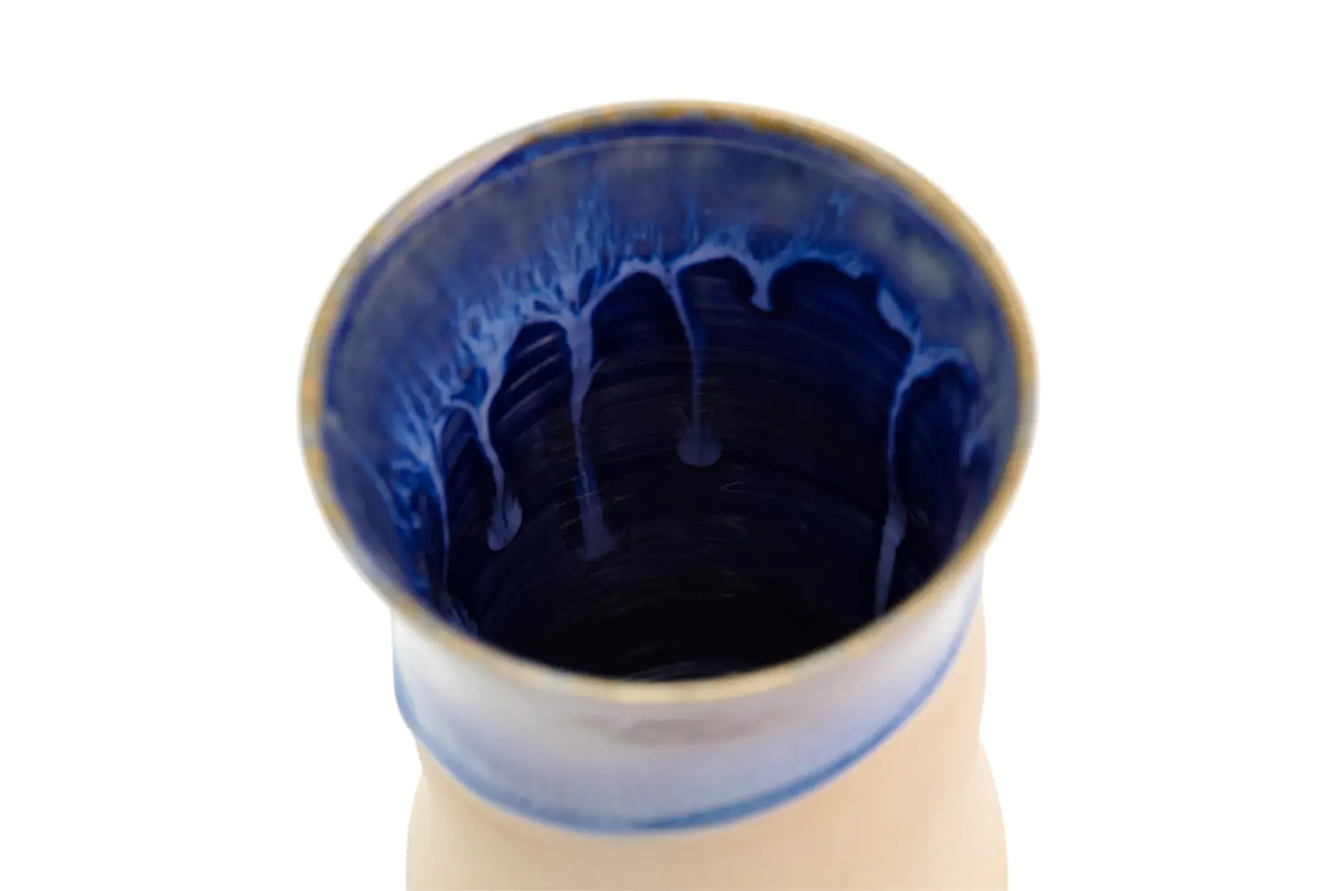 Each vase is carefully crafted using white clay and a potter’s wheel. Hadas shapes the vases with a subtle functional curve at the base, and the hand-poured two-tone blue glaze evokes the Mediterranean Sea on a warm summer day, adding a serene and elegant touch to any space.