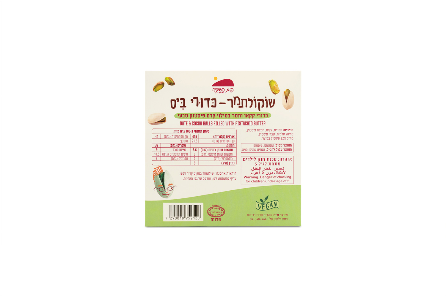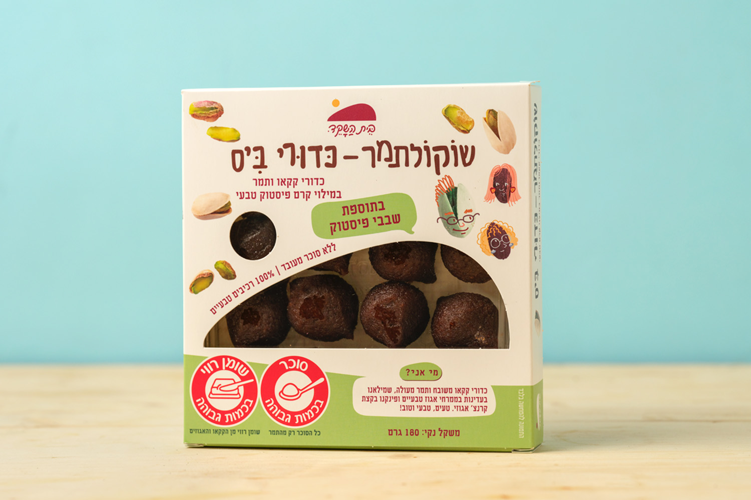 These soft date and cocoa bites from Beit HaShaked capture the familiar sweetness of Israel’s orchards and the gentle richness of pistachio butter. Each piece begins with naturally blended dates, cocoa, and coconut, shaped by hand into smooth rounds with a center of pure velvety pistachio. When you take a bite, the outside gives way to a creamy, nut forward filling that feels earthy and bright — the unparalleled flavor of real pistachios grown under Mediterranean sun.