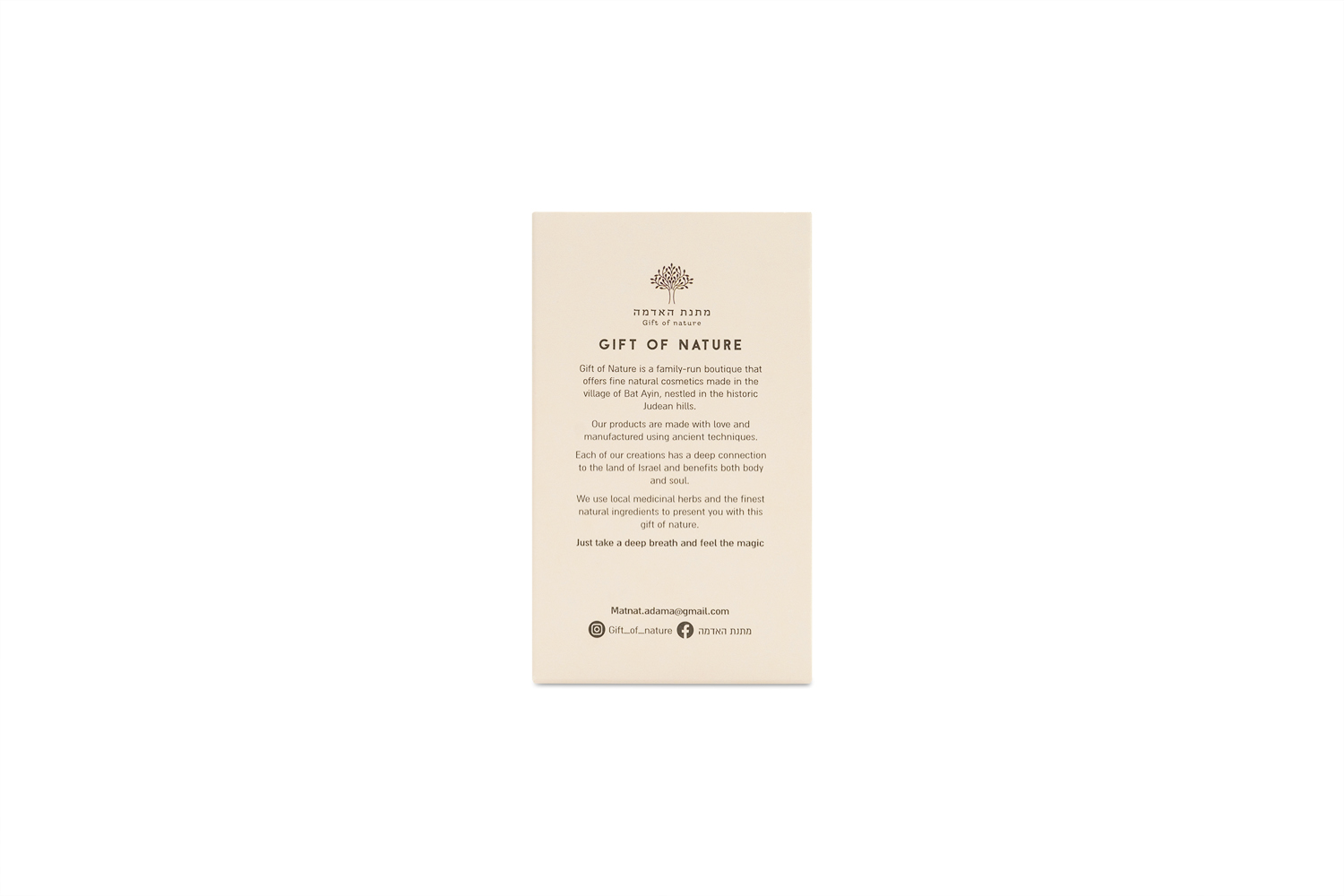 The mist was developed by Shlomit Cohen, founder of Gift of Nature, whose remedies embody her daily life and close relationship with the land surrounding her home in Bat Ayin. Working in small batches, she sources many of her ingredients locally, which allows the character of each essential oil to remain clear and authentic.