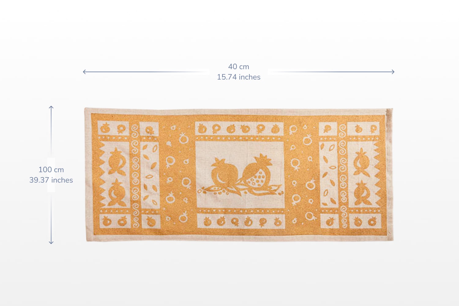 The linen table runner has a gold-on cream chic silk printed pomegranate design. Pomegranate is one of the seven species of the Holy Land, and this design can dress up a table for special meals such as Shabbat or holidays, and it is equally at home for a family weekday dinner.