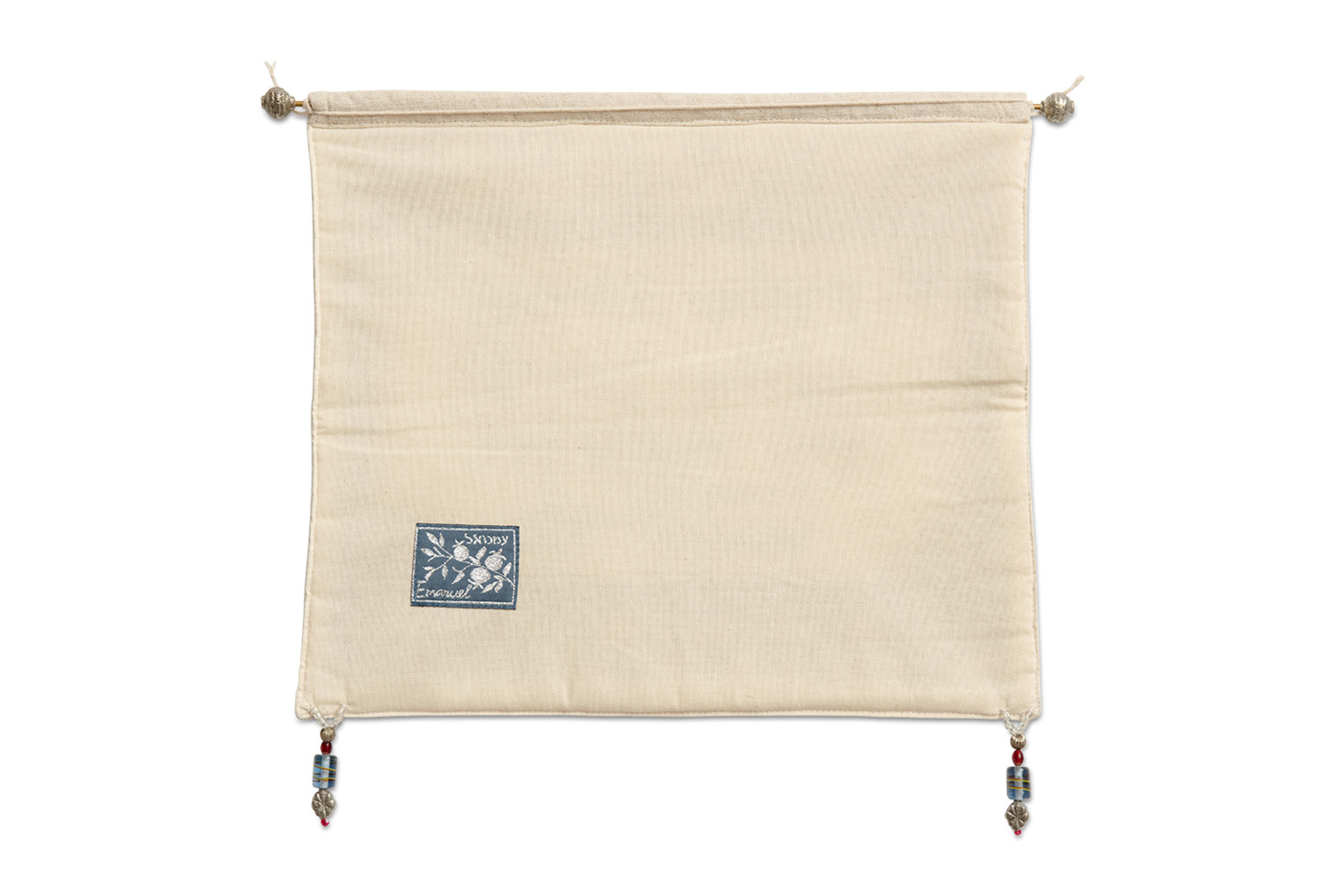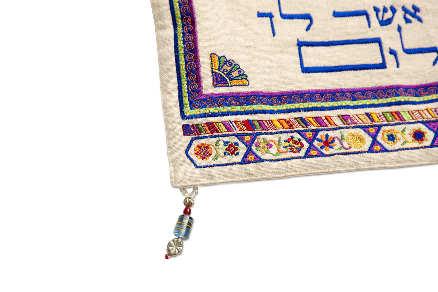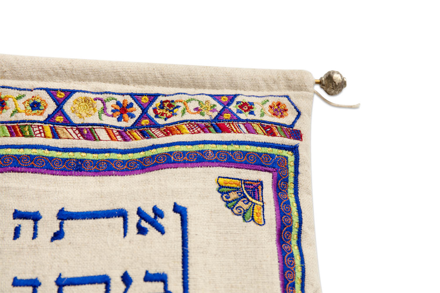 Bring the beauty and spirit of Israel into your home with this exquisitely embroidered wall hanging by Emanuel Judaica. It is crafted from a natural-colored fabric and adorned with intricate embroidery that reflects the richness of Jewish tradition and artistry.