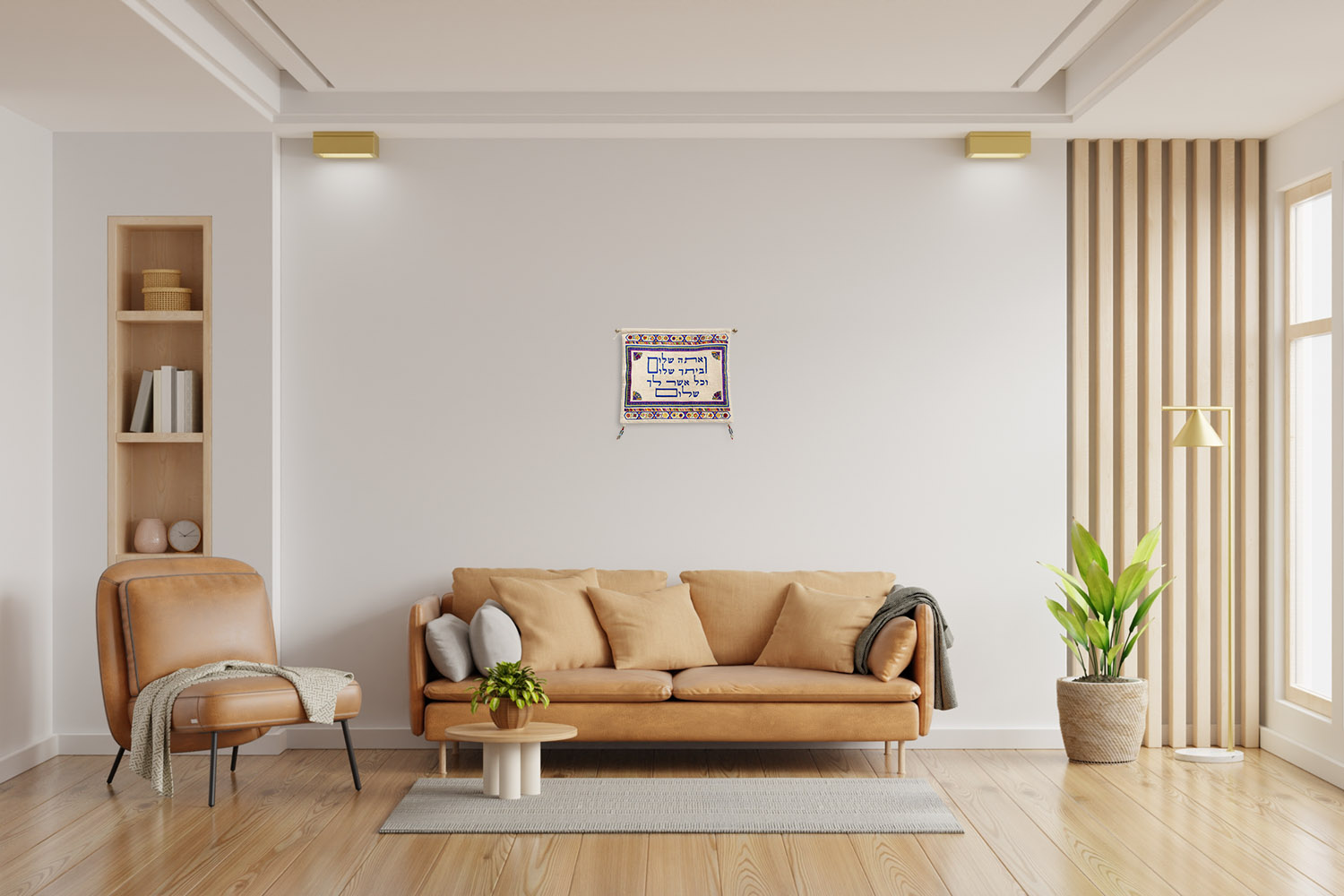 At the center, the Hebrew phrase “ואתה שלום וביתך שלום וכל אשר לך שלום” (“You are peace, your home is peace, and all that is yours is peace”) is stitched in deep blue thread, symbolizing harmony and protection. Surrounding the text is an ornate embroidered border with vibrant floral and geometric patterns, inspired by Middle Eastern and Persian Jewish art. The tapestry is finished with hand-sewn bead and metal embellishments, adding elegance and a unique handcrafted touch.