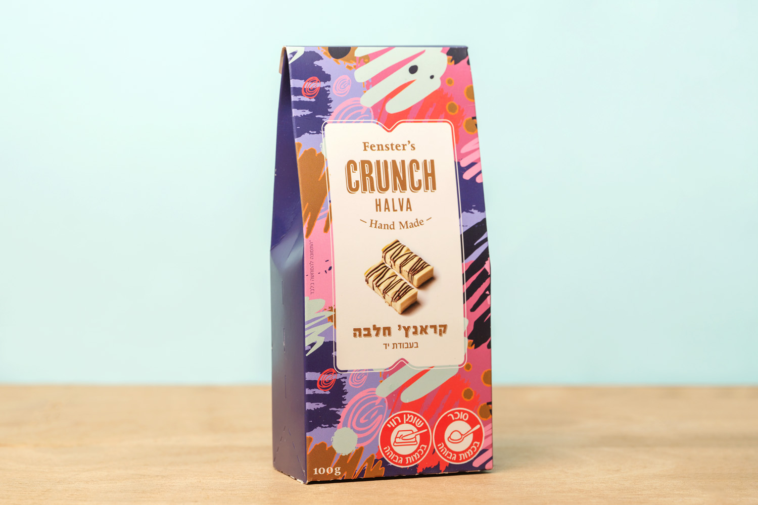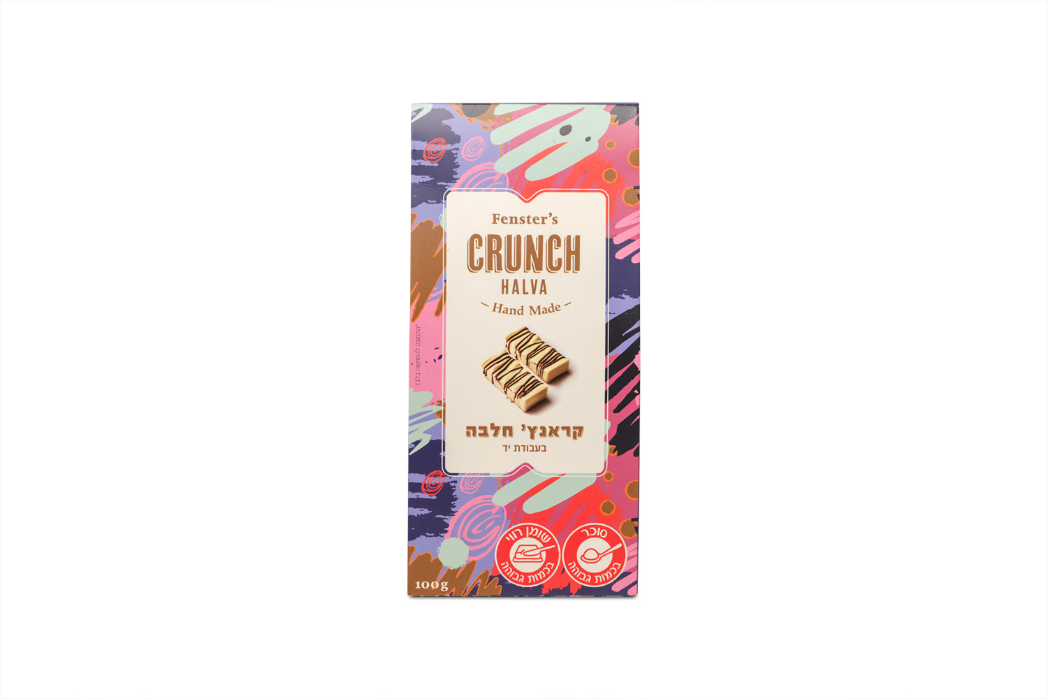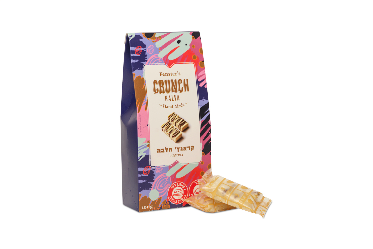 Halva has an everyday presence in Israel, sold by weight in markets, cut fresh at neighborhood shops, and eaten as a small, satisfying sweet after meals or with coffee. Fenster’s Caramel Crunch Halva takes that familiar sesame base and adds layers that reflect how Israeli confectioners often build on tradition. This bar starts with classic halva made from tahini, then introduces a caramel white layer and a thin chocolate drizzle that adds contrast in both texture and taste.