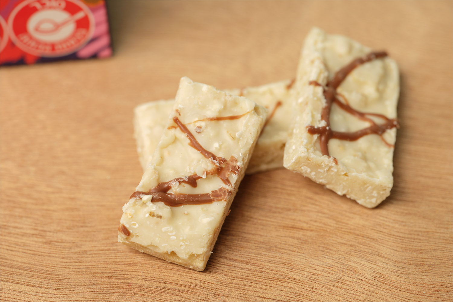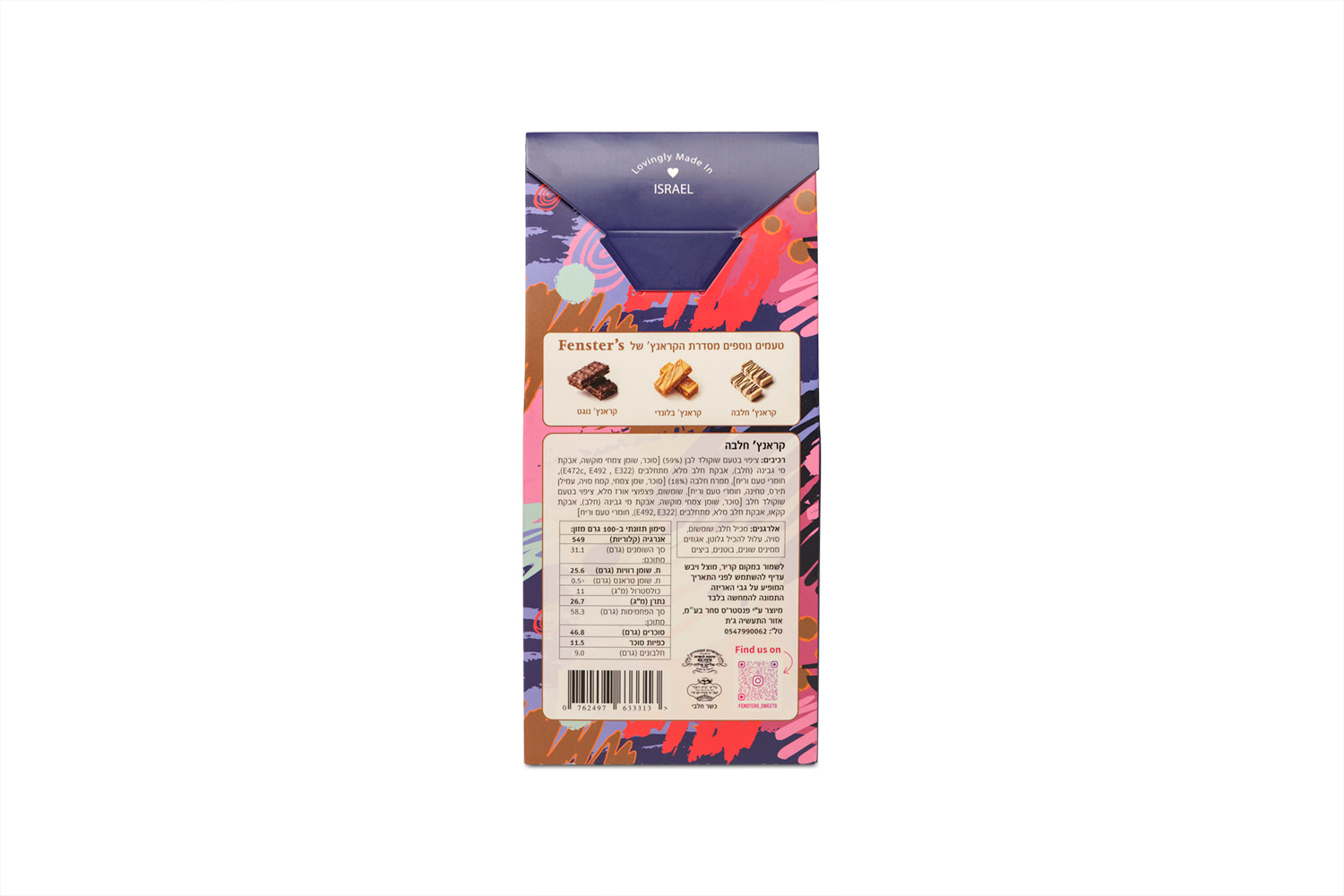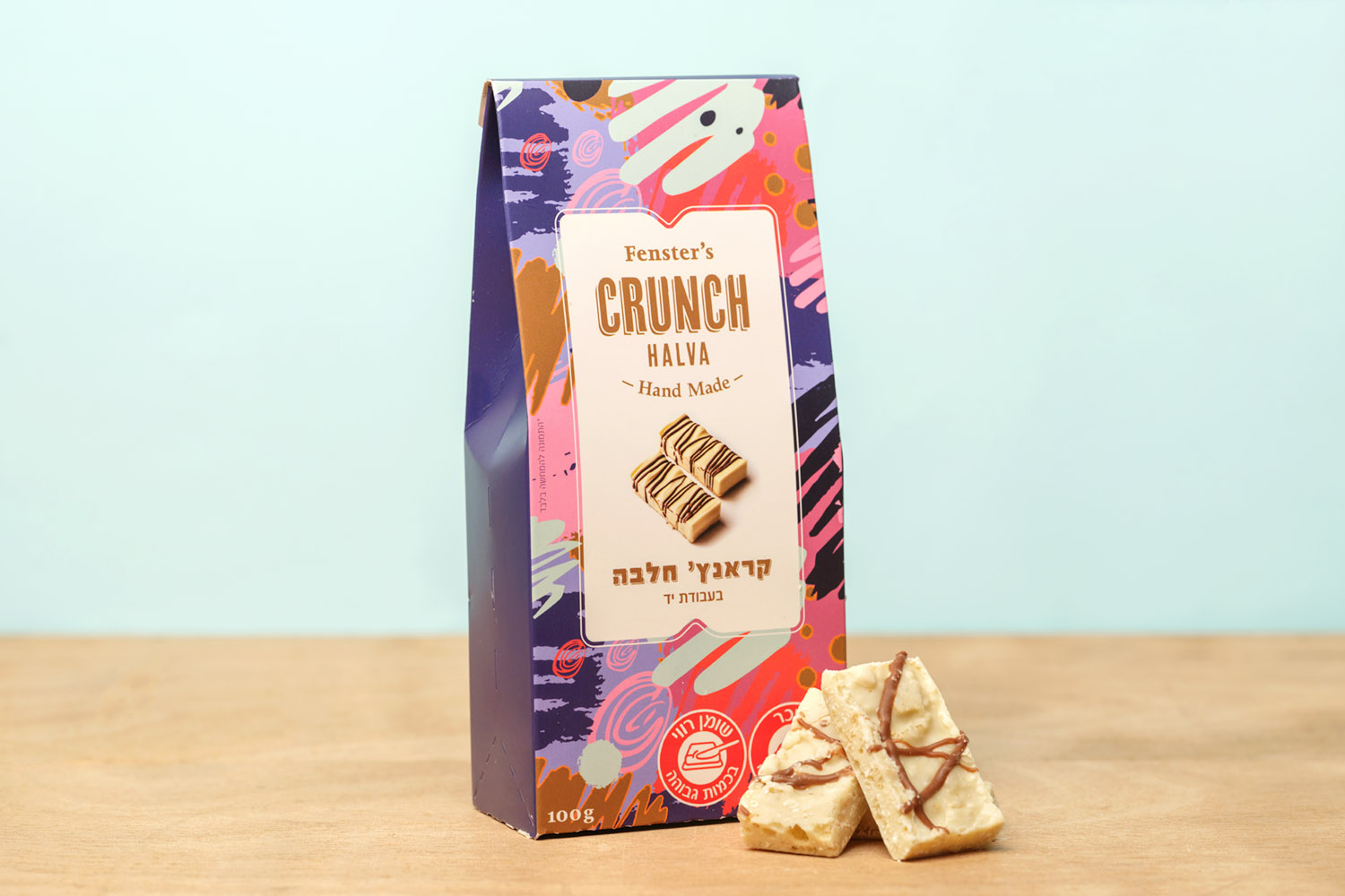 Halva has an everyday presence in Israel, sold by weight in markets, cut fresh at neighborhood shops, and eaten as a small, satisfying sweet after meals or with coffee. Fenster’s Caramel Crunch Halva takes that familiar sesame base and adds layers that reflect how Israeli confectioners often build on tradition. This bar starts with classic halva made from tahini, then introduces a caramel white layer and a thin chocolate drizzle that adds contrast in both texture and taste.