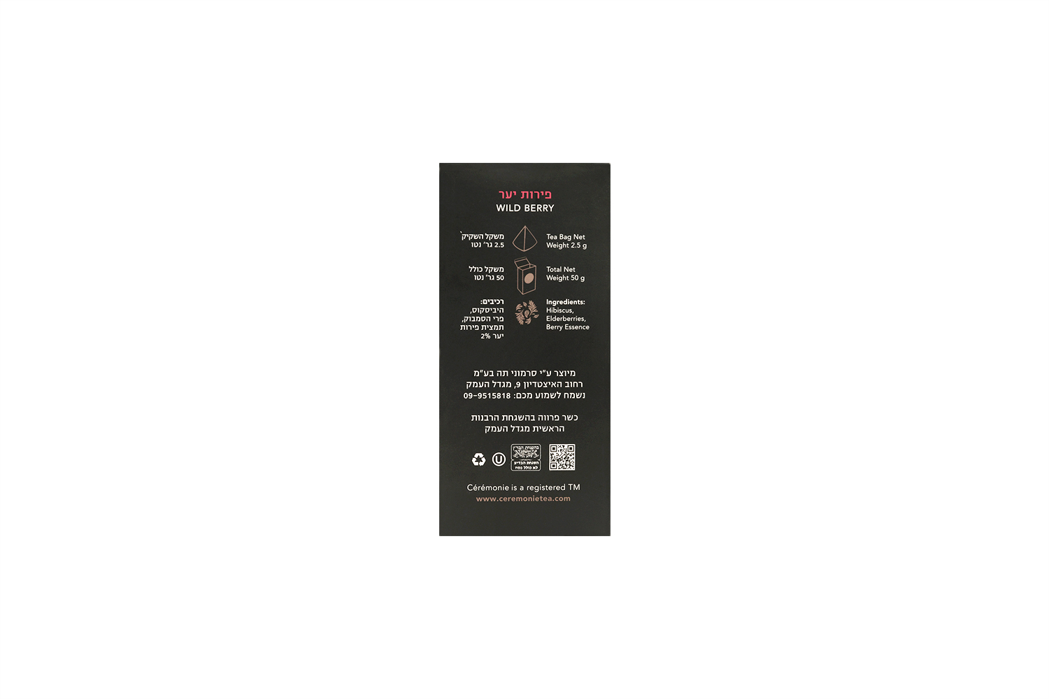 Bright, juicy, and vibrantly aromatic, this Wild Berry Herbal Fruit Infusion from Ceremonie Tea in Israel delivers a bold ruby-red cup bursting with tart-sweet berry flavor. Each sachet in this full-size 20-count box contains 2.5 g (0.088 oz) of hibiscus petals, real elderberries, and a touch of natural berry essence that enhances the infusion’s depth and fragrance. The result is a lively, refreshing herbal drink—naturally caffeine-free and delicious served hot or iced. Hibiscus and elderberries are traditionally enjoyed for their vibrant antioxidant properties, with hibiscus supporting hydration and circulation while elderberries are known for helping the body’s natural immune defenses, creating a bright, fortifying herbal infusion.