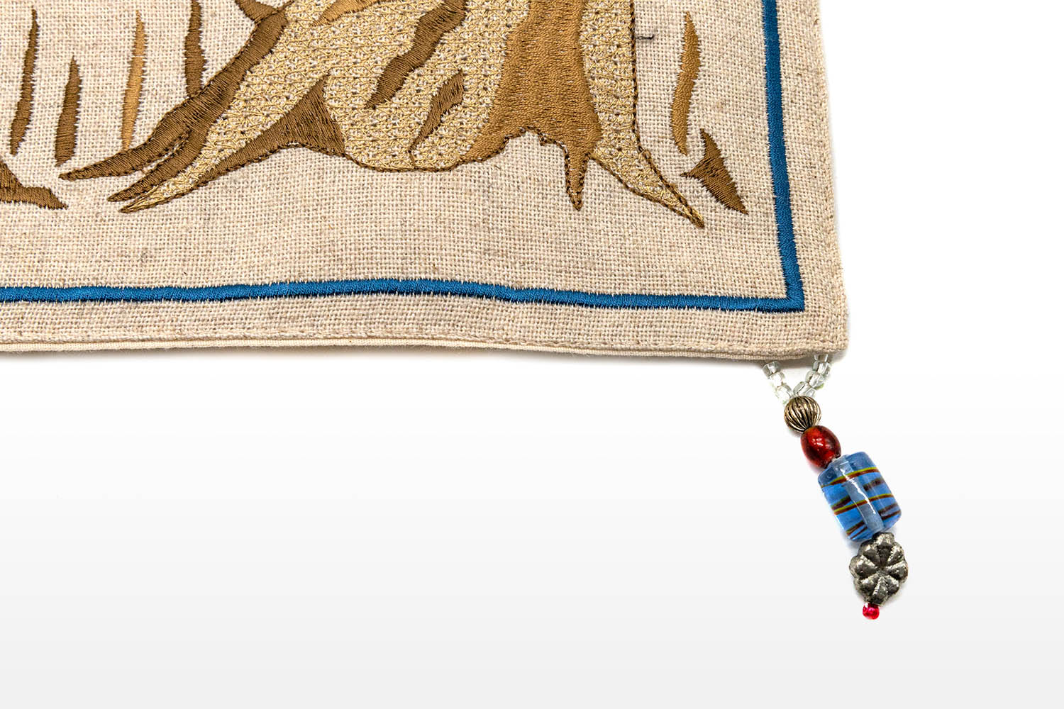 Emanuel has a way of capturing the beauty of Judaism, Israel, and the Jewish people. He brings a traditional Jewish text and song to life with this charming wall hanging. Embroidered in Hebrew are the words to the song Ilan Ilan.“Tree, tree, wherewith can I bless thee?