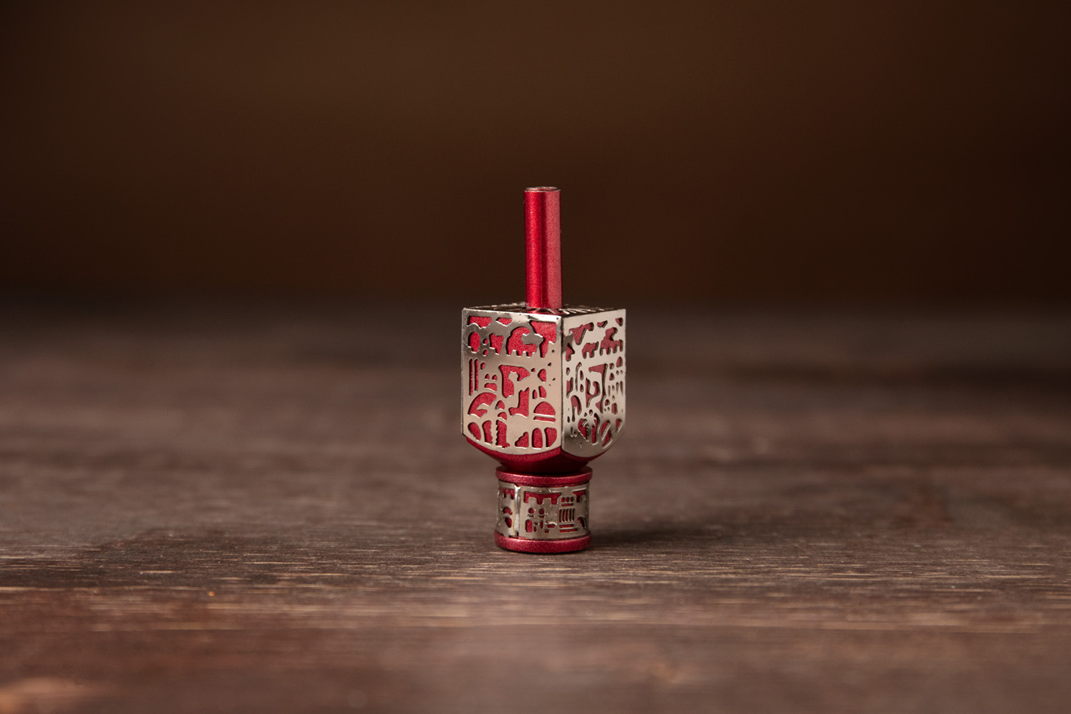 This exquisite Jerusalem themed dreidel from Emanuel Judaica is a perfect fusion of tradition and contemporary artistry. Made from high quality metal, it features a striking red and silver design, with intricate laser cut panels depicting the Jerusalem skyline, including its iconic domes, archways, and historic architecture. Each Hebrew letter – Nun, Gimel, Hey, and Peh – is seamlessly integrated into the cutout design, making this dreidel both a functional game piece and a heartfelt decoration for your home.