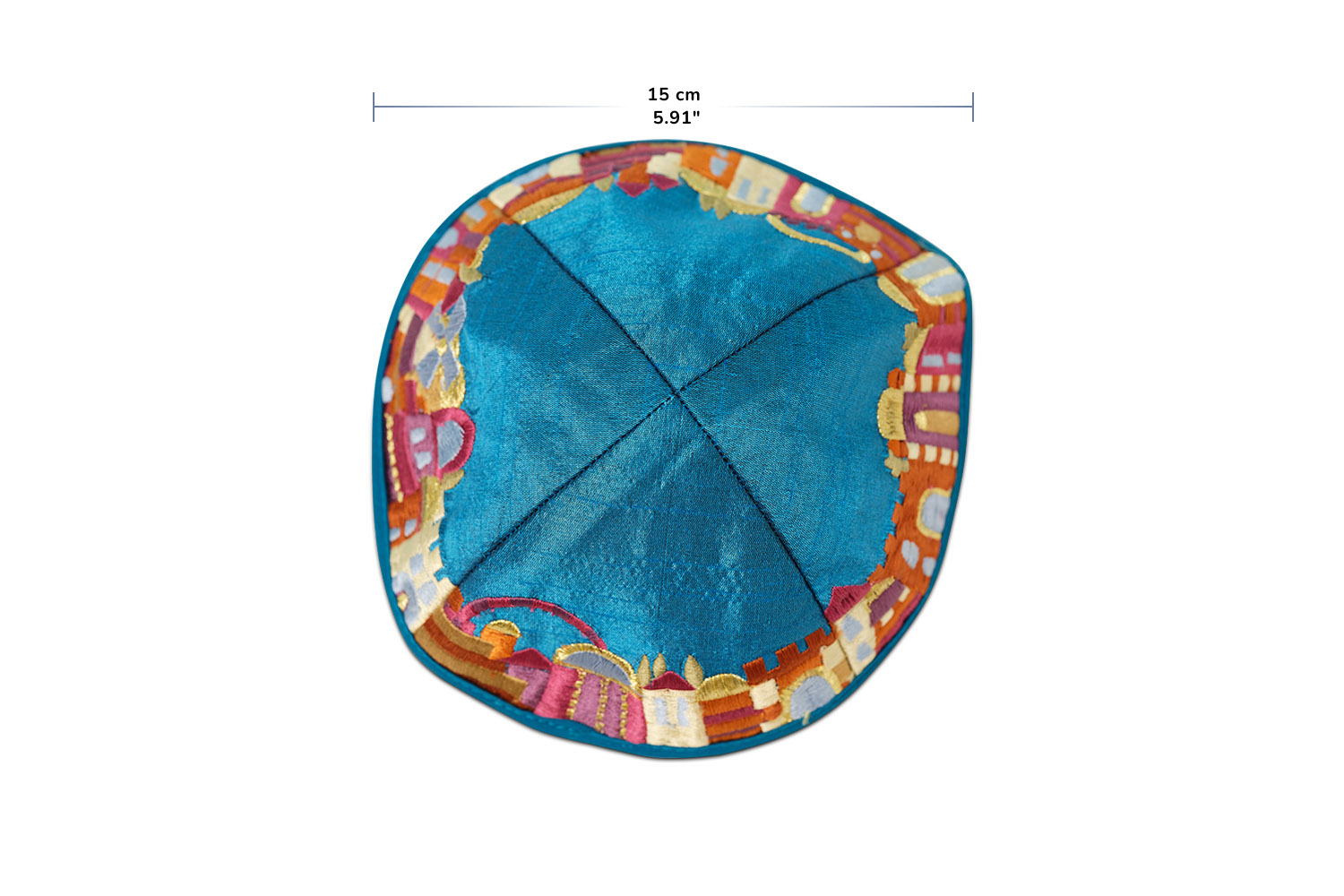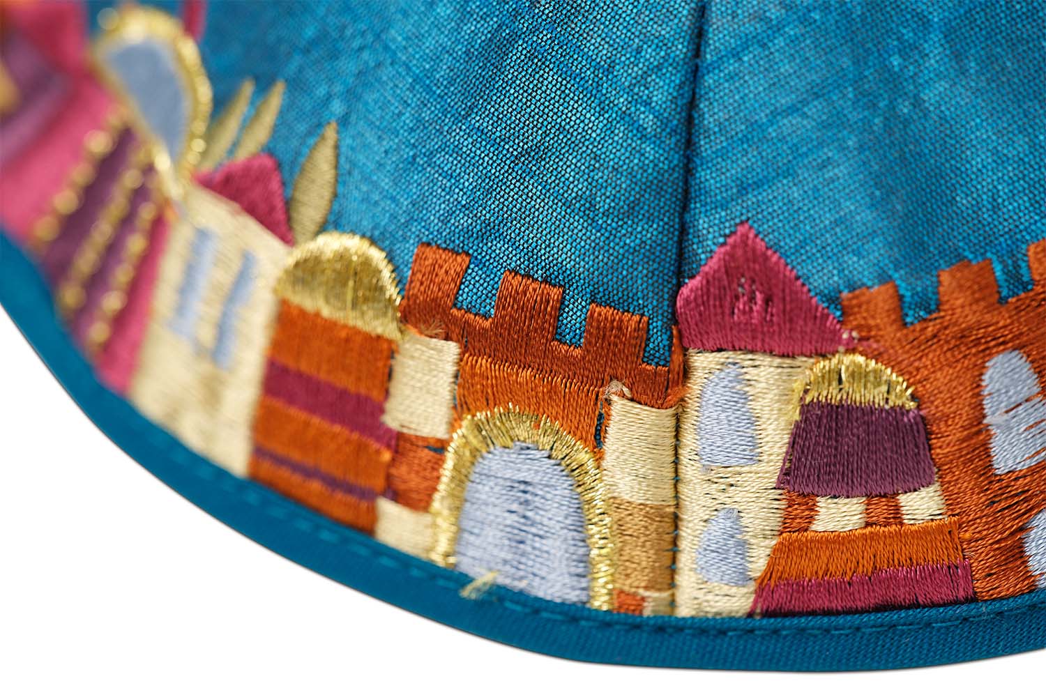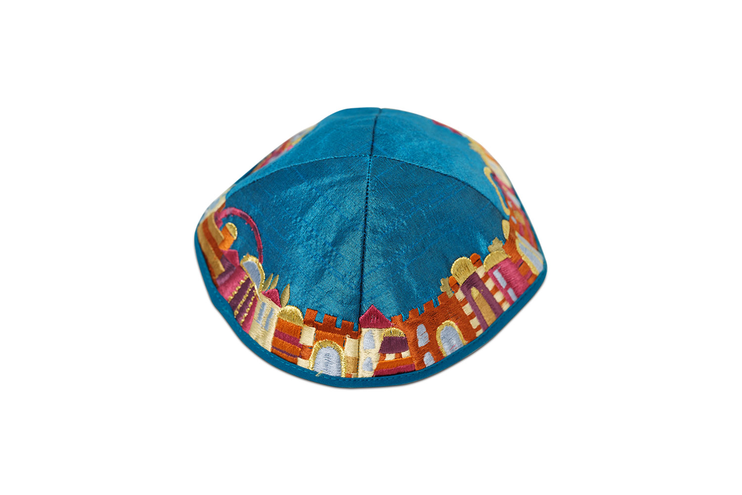 This elegant kippah captures the beauty and spirituality of Jerusalem, bringing a touch of the Holy Land to every occasion. Made from rich silk in a deep teal hue, this kippah is adorned with an intricately embroidered depiction of Jerusalem’s ancient walls, archways, and domed rooftops in warm shades of gold, burgundy, and blue. The detailed embroidery brings the historic city to life, making this kippah a meaningful expression of faith and tradition.