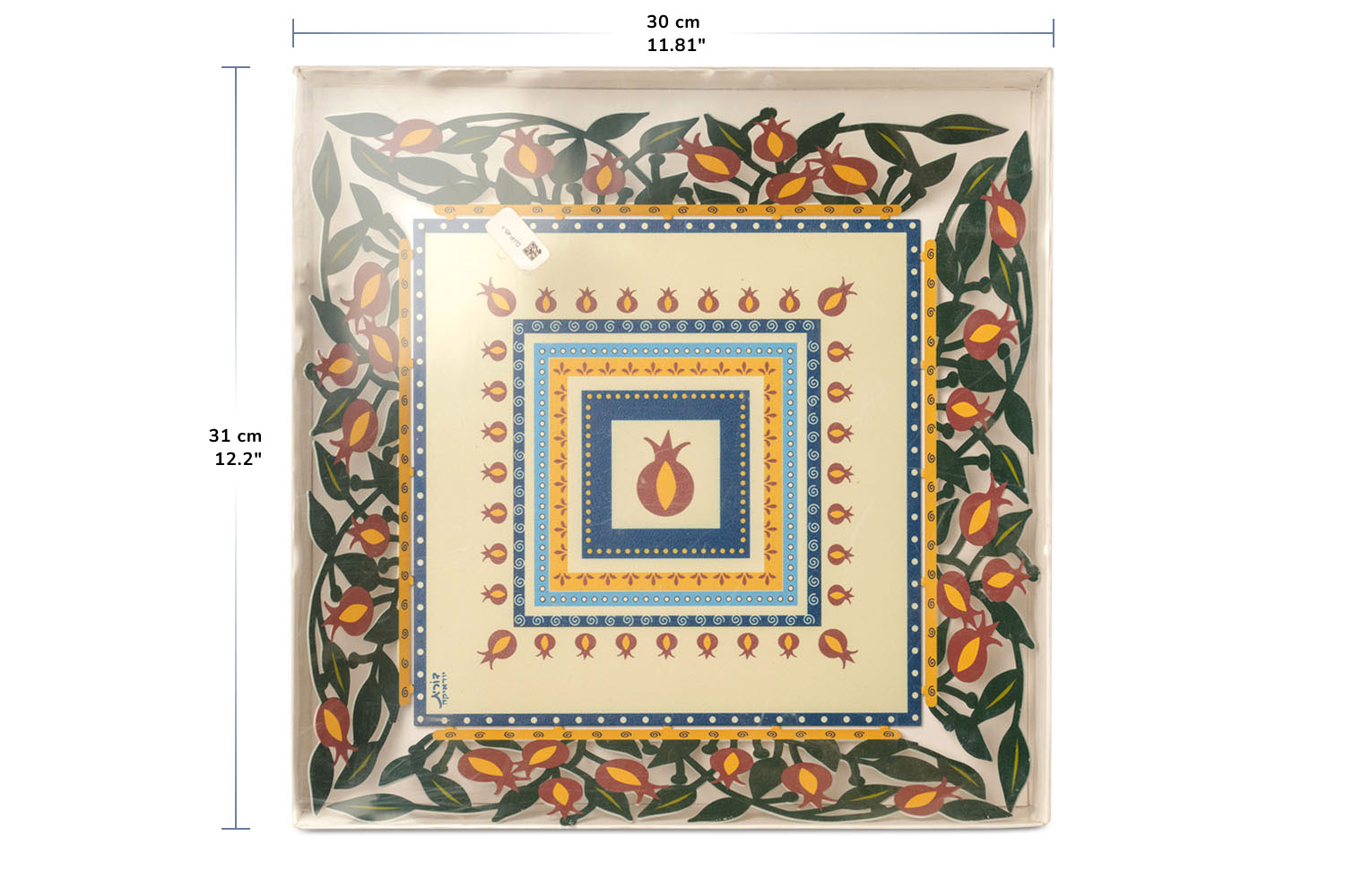 Israeli Judaica artist Dorit’s perfectly versatile stainless steel laser-cut serving tray with a charming pomegranate design comes with a tempered glass overlay making it as practical as it is beautiful.