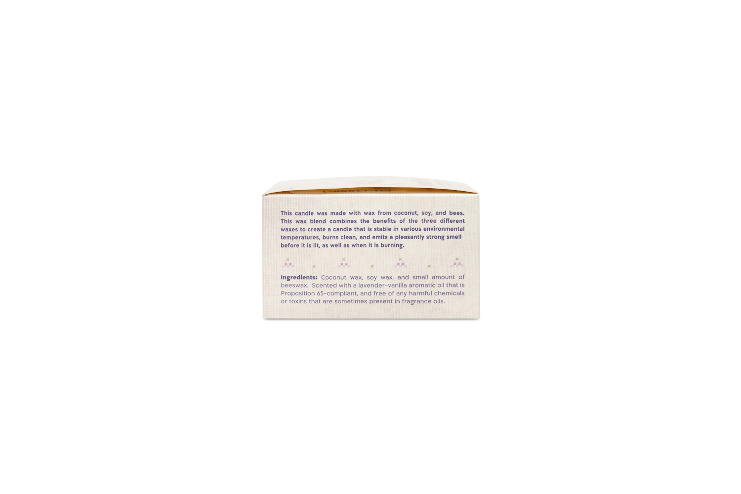 Coconut wax, soy wax, beeswax, lavender-vanilla fragrance oil