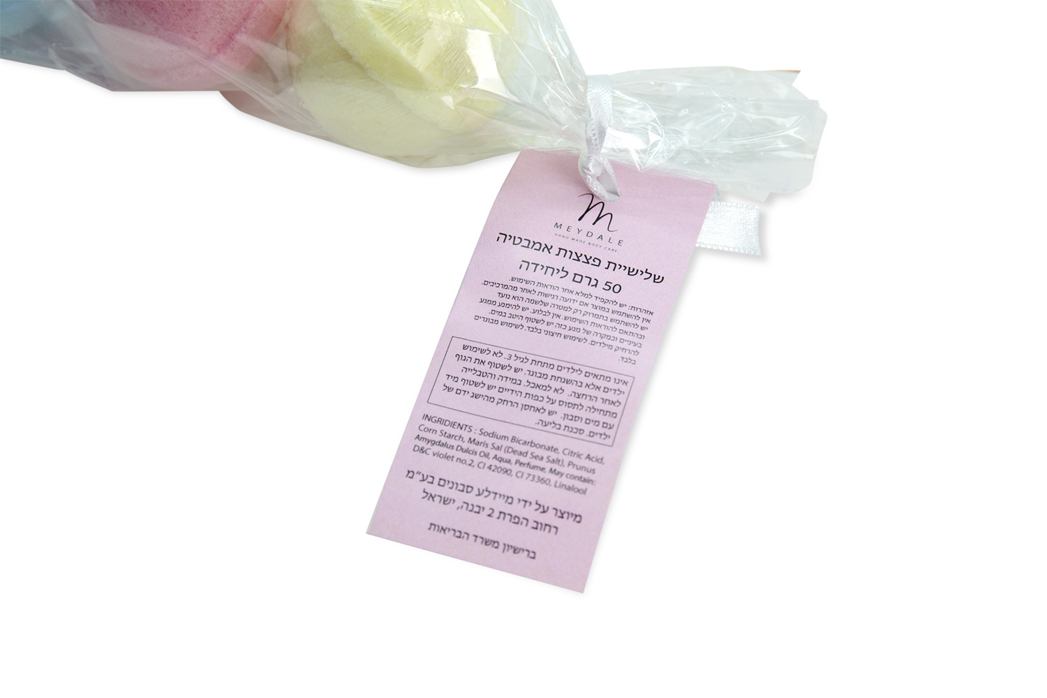 Turn bath time into the ultimate spa experience with these luxurious natural bath bombs by Meydale! This multi-color trio of 50gm bath bombs has been prepared to bring you the finest Israel spa experience—in your own bath!