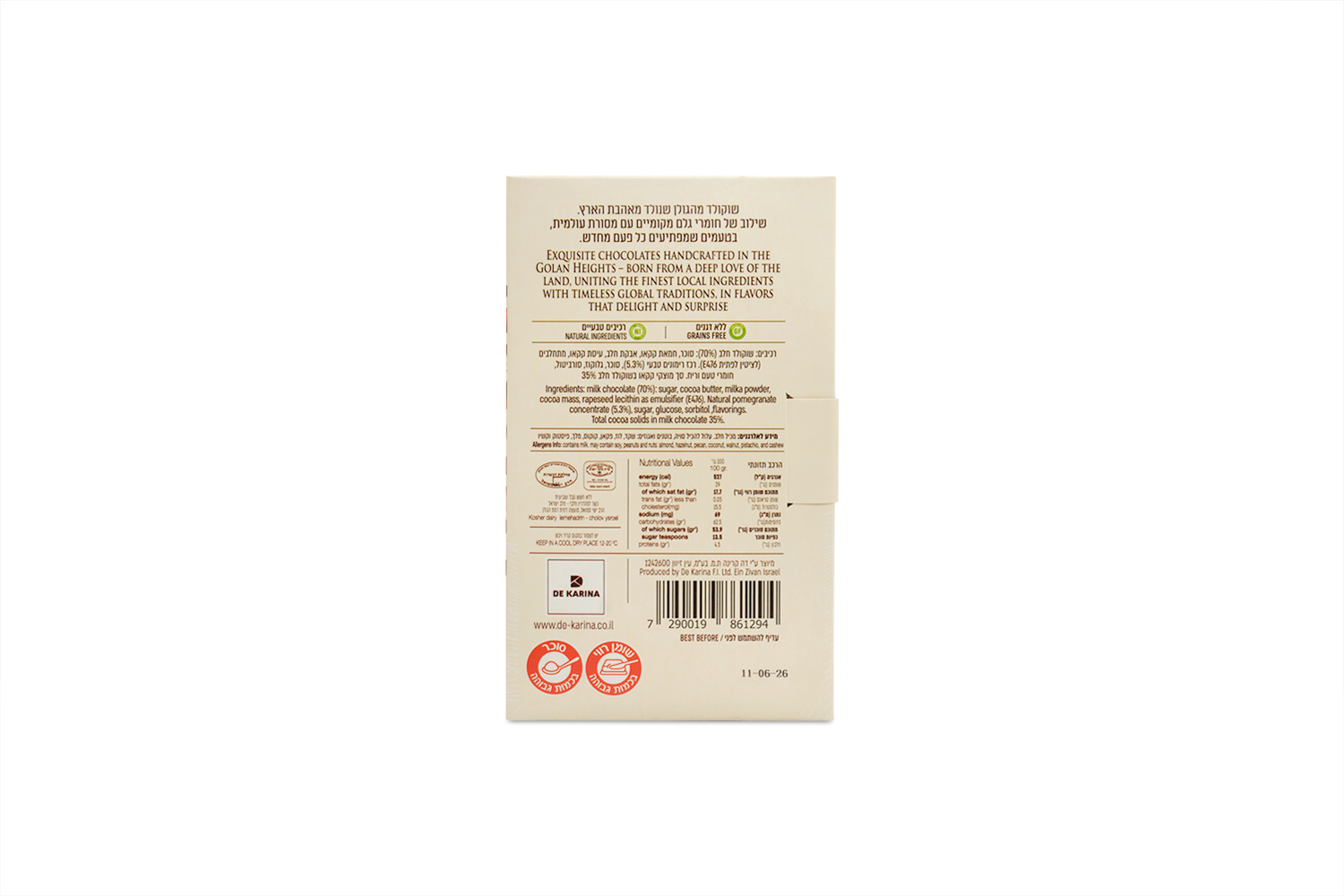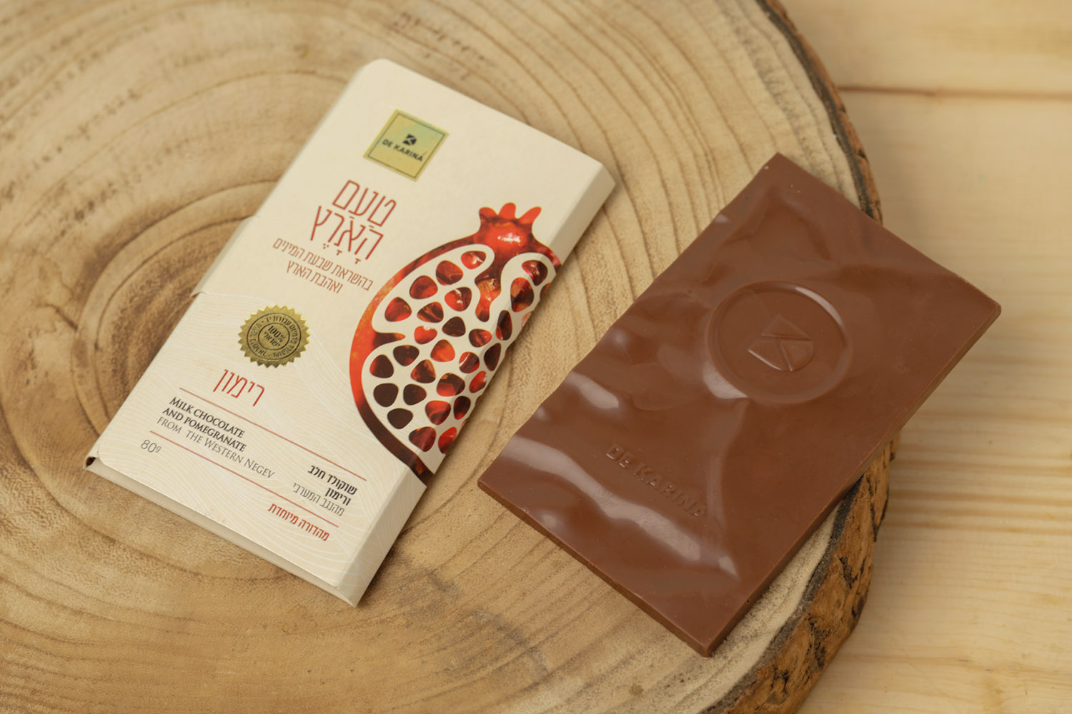 This bar embodies that blend: natural milk chocolate infused with salted caramel, made with 100% natural ingredients and crafted according to more than a century of accumulated family knowledge. De Karina’s team still works in small batches, emphasizing traditional tempering, hand-finishing, and local sourcing whenever possible. Every bar supports a business that has become a cultural anchor in the Golan, employing local residents and helping preserve the unique character of this frontier region.