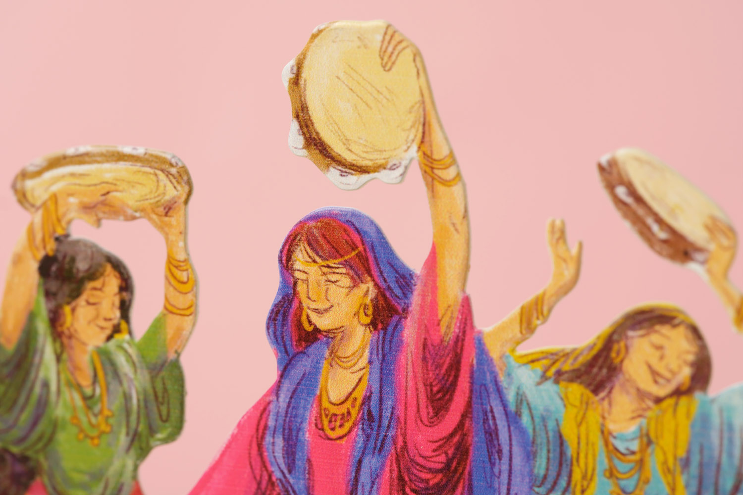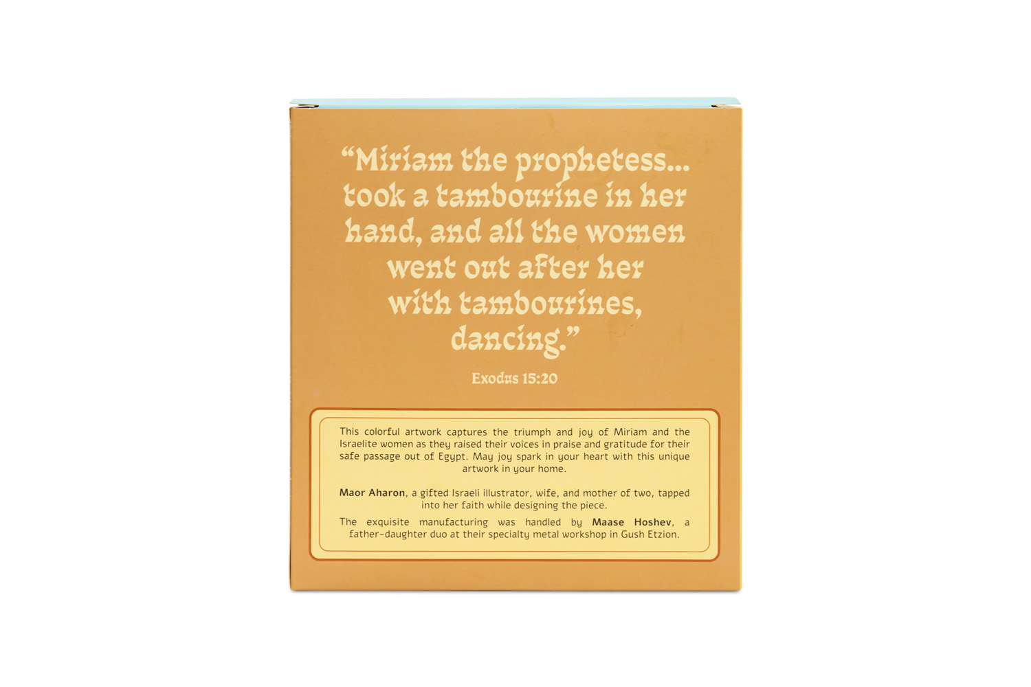 Designed by Maor Aharon, a gifted Israeli illustrator, wife, and mother of two, this piece brings the biblical story to life with rich colors and expressive movement. The women’s flowing garments in bold hues of red, blue, and green convey the energy and joy of their celebration. Printed on durable metal, the display stands freely on a gold-toned base, which bears the scripture verse as a reminder of the strength and resilience of the Jewish people.
