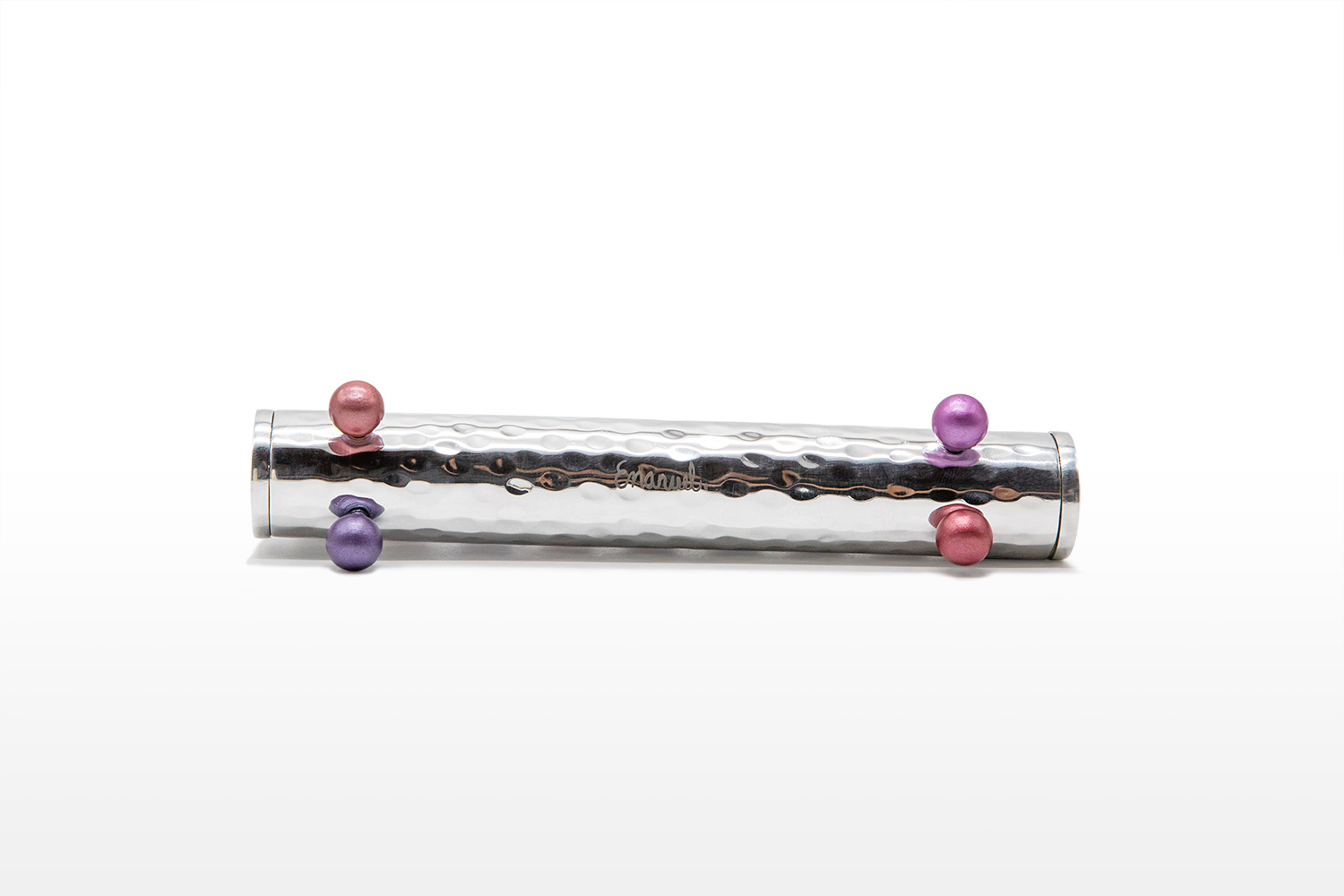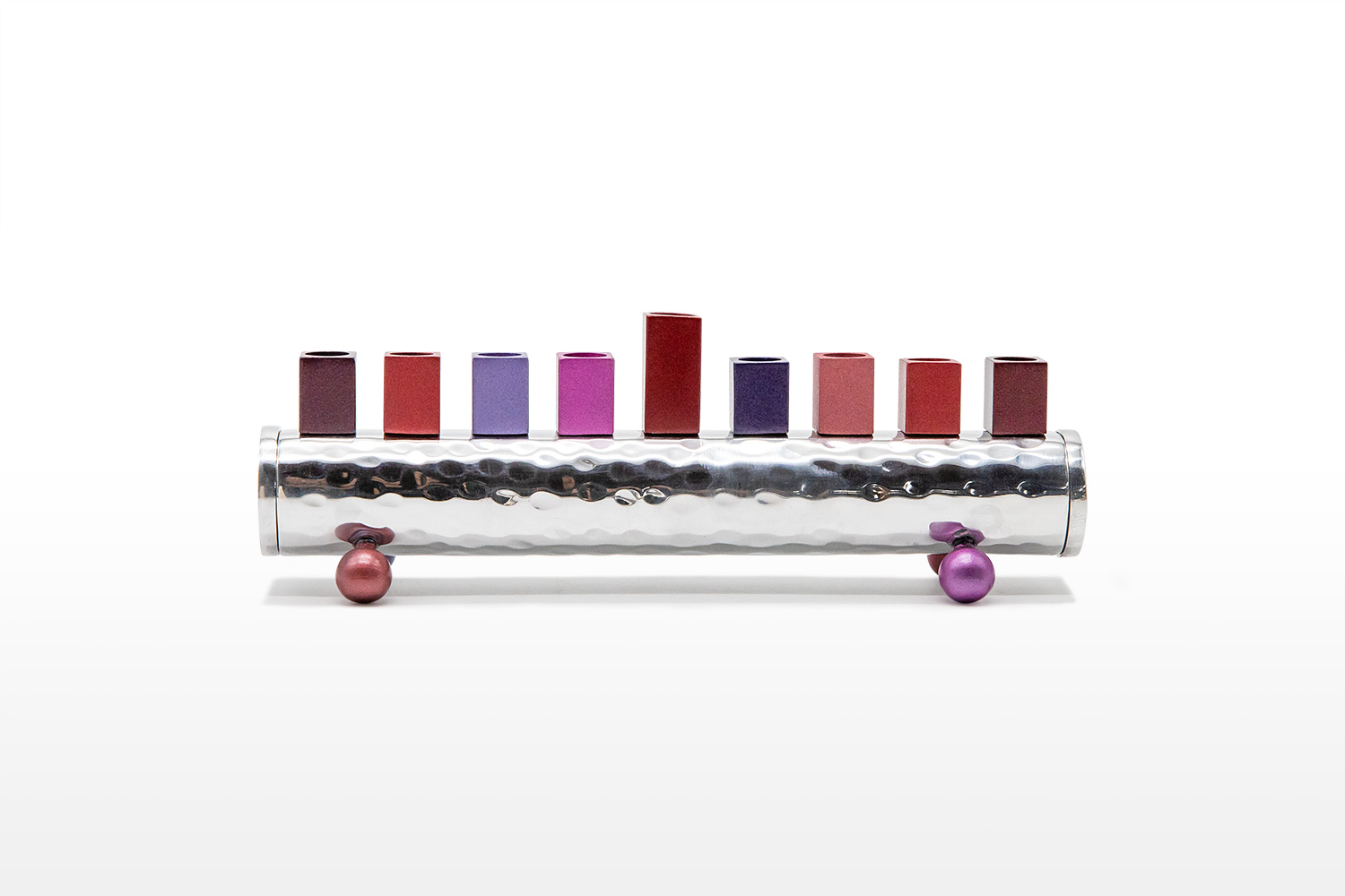 Emanuel has crafted an elegant modern hanukiah made from hammered metal with colored round feet and a series of maroon holders for the candles. It adds a touch of sparkle and charm to any home.