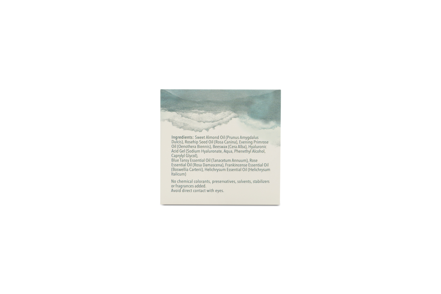 Ingredients: Sweet almond oil (Prunus Amygdalus Dulcis), rosehip seed oil (Rosa Canina), evening primrose oil (Oenothera Biennis), beeswax (Cera Alba), hyaluronic acid gel (Sodium Hyaluronate, Aqua, Phenethyl Alcohol, Caprylyl Glycol), blue tansy essential oil (Tanacetum Annuum), rose essential oil (Rosa Damascena), frankincense essential oil (Boswellia Carterii), helichrysum essential oil (Helichrysum Italicum).