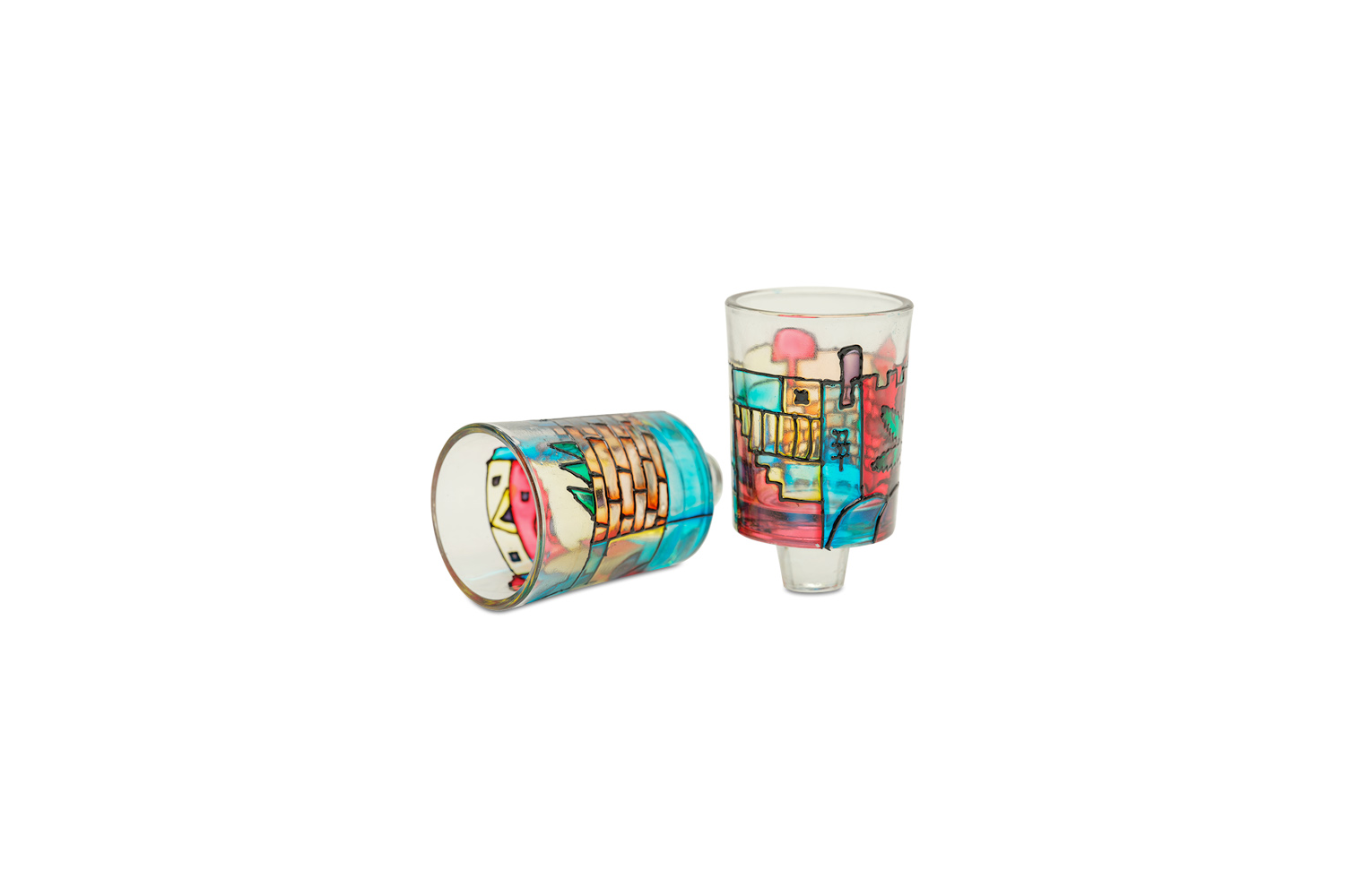 Enhance your candle lighting experience with a pair of colorfully decorated glass candle holders. Each glass from Israeli Judaica designer Emanuel features a vivid scene of Jerusalem circling the candle holder.