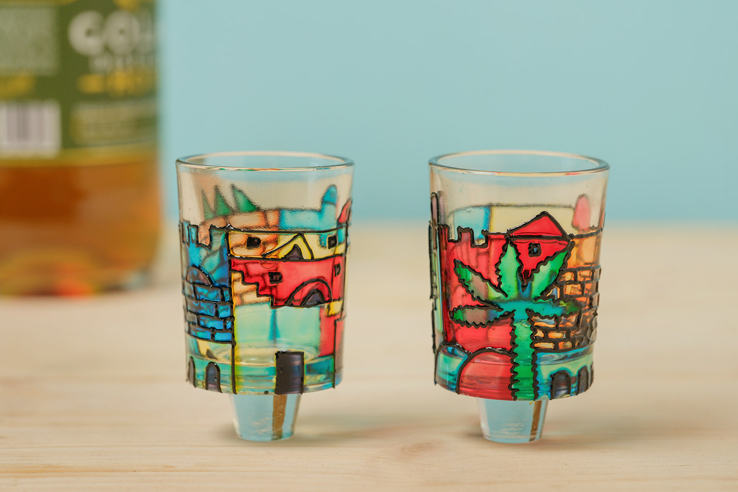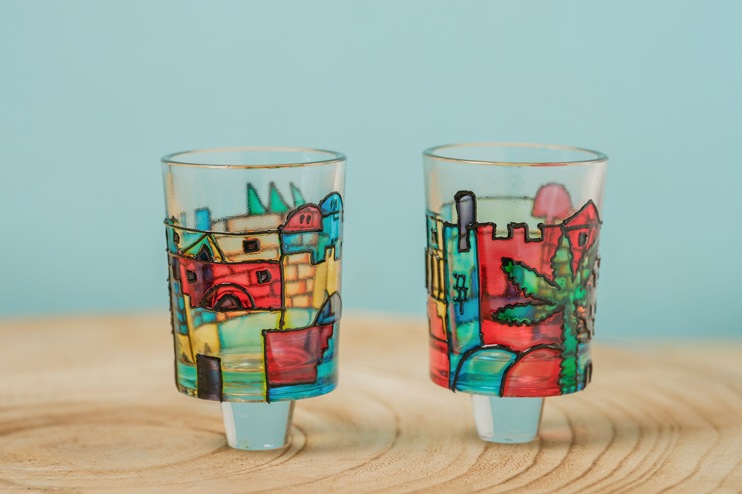Emanuel has brought his signature charm to these brightly decorated candle holders. The glasses are decorated with a simple design reminiscent of the Holy City of Jerusalem. When you use these beautiful glasses for your Shabbat candles, you will bring a touch of the holy city into your home!