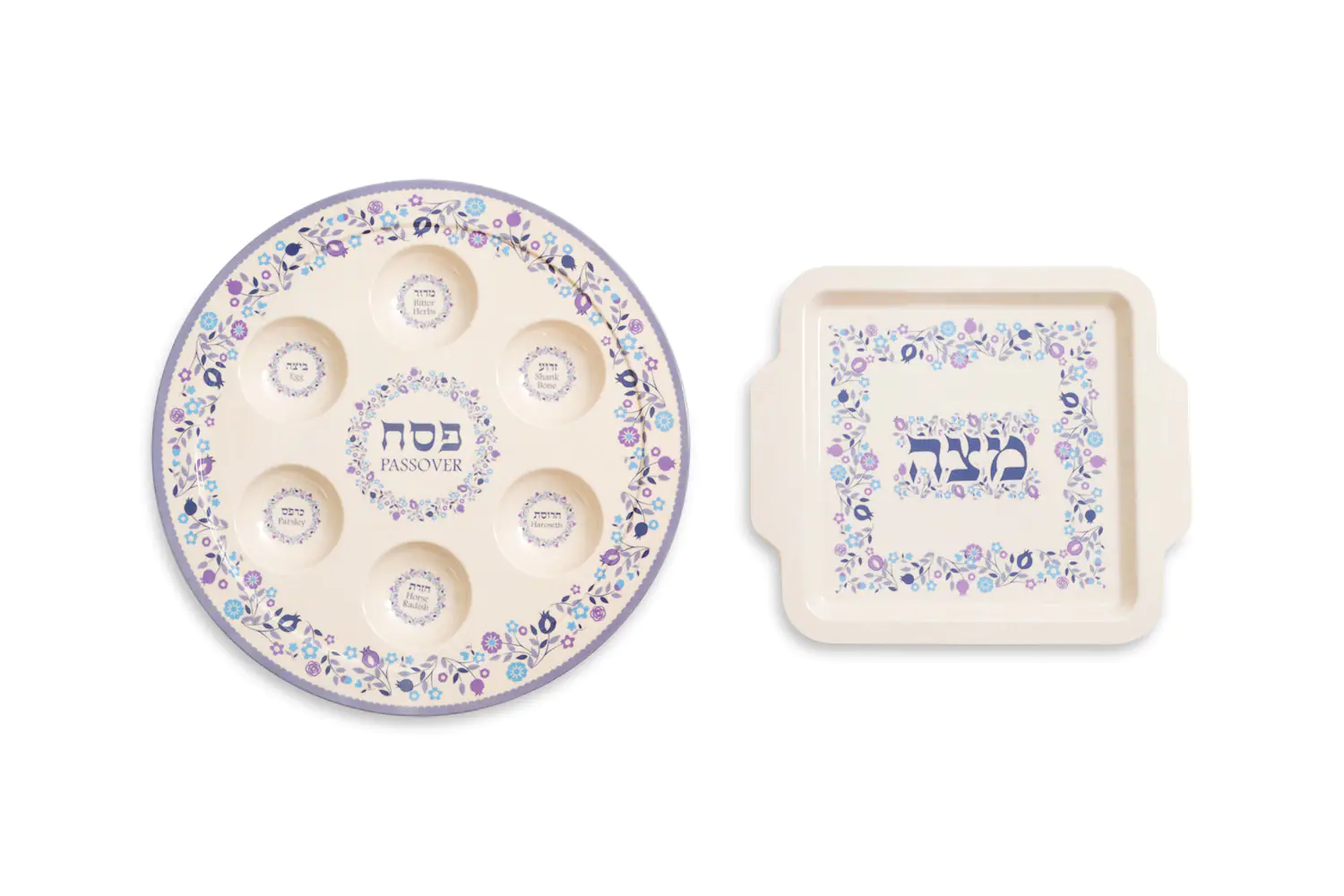 This Seder Plate and Matzah Tray Set will bring elegance and vibrancy to your Passover table. The Seder plate is adorned with a vibrant floral motif, where delicate blue and purple flowers form a stunning border. These intricate designs evoke the natural beauty of Israel’s landscapes, symbolizing renewal and hope – a central theme of Passover.