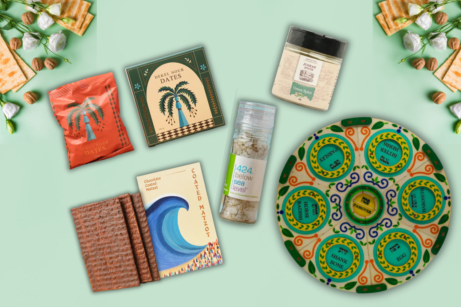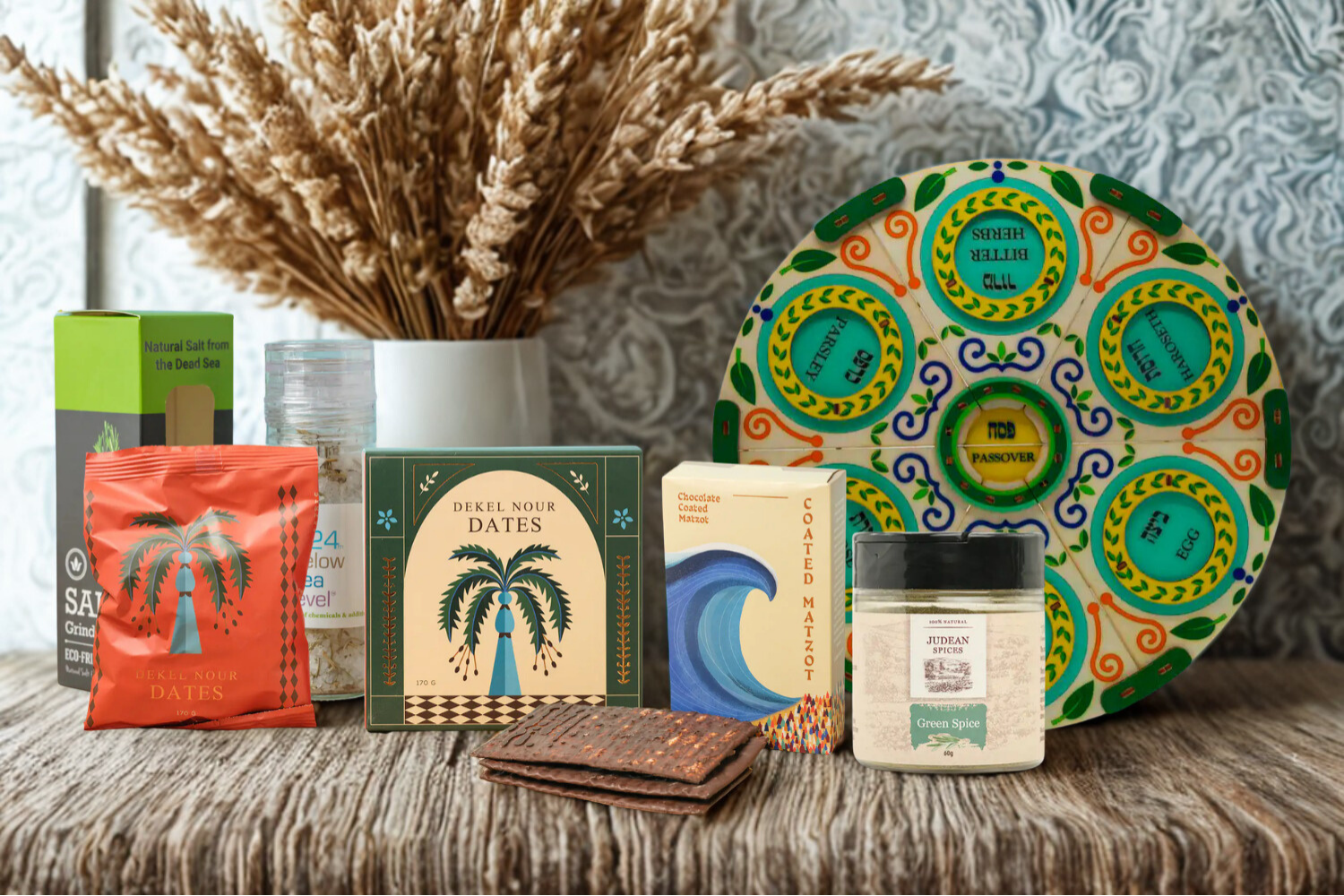 This thoughtfully curated Passover set brings together five meaningful elements that honor the spirit of the holiday — renewal, gratitude, and togetherness. Each item has been carefully selected to complement the Passover table: naturally sweet Deglet Noir dates, aromatic Judean Spices — Green Spice blend, organic rosemary-infused Dead Sea salt, crisp coated matzos, and a beautifully designed colorful Seder plate.