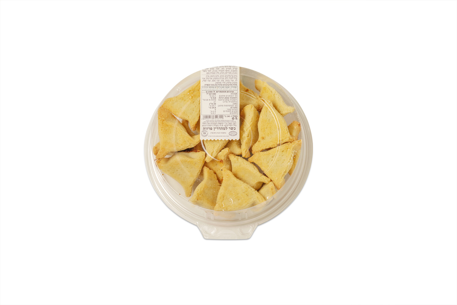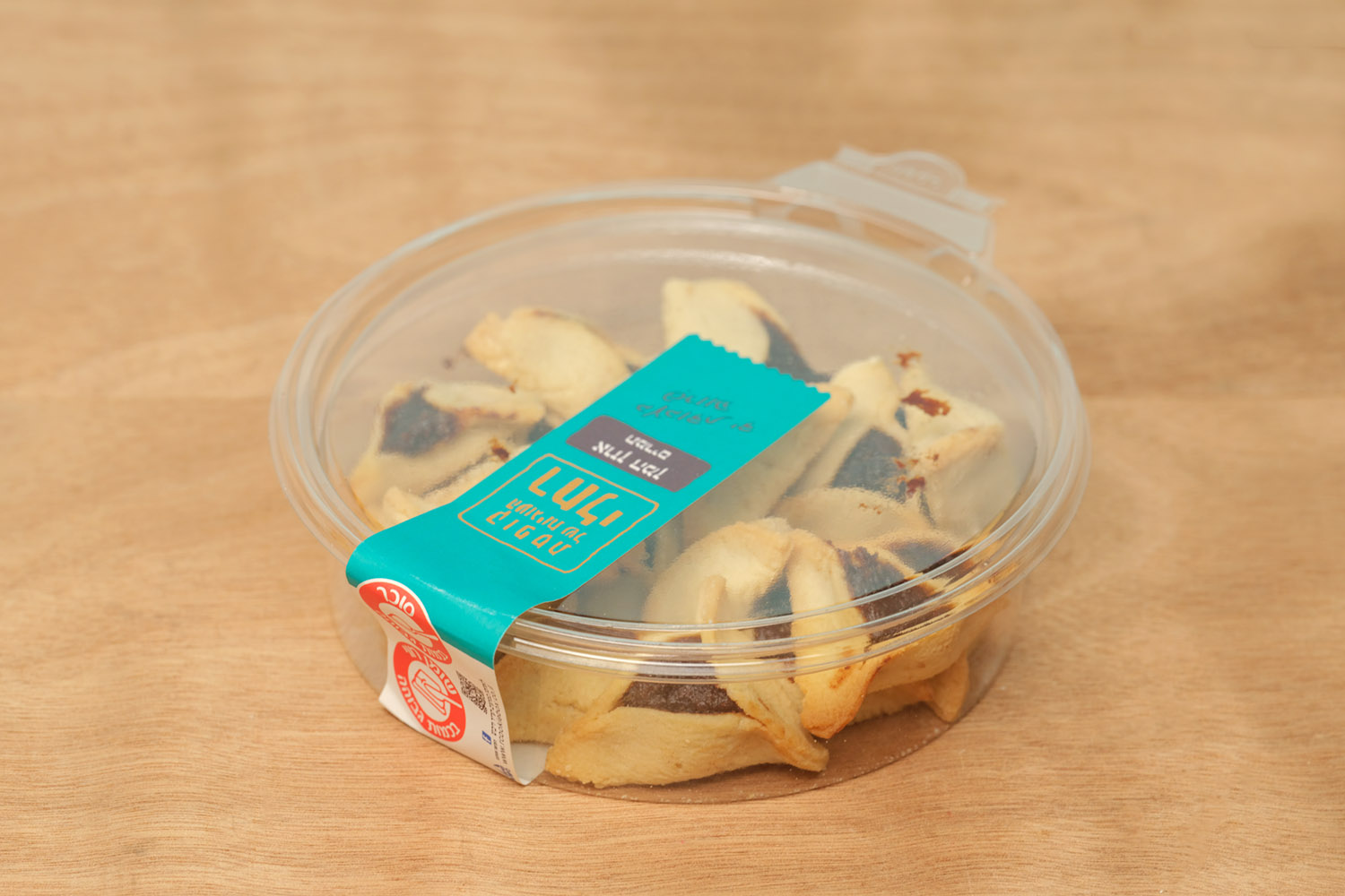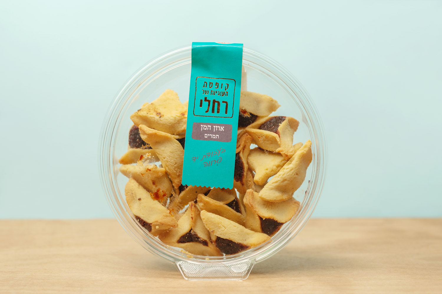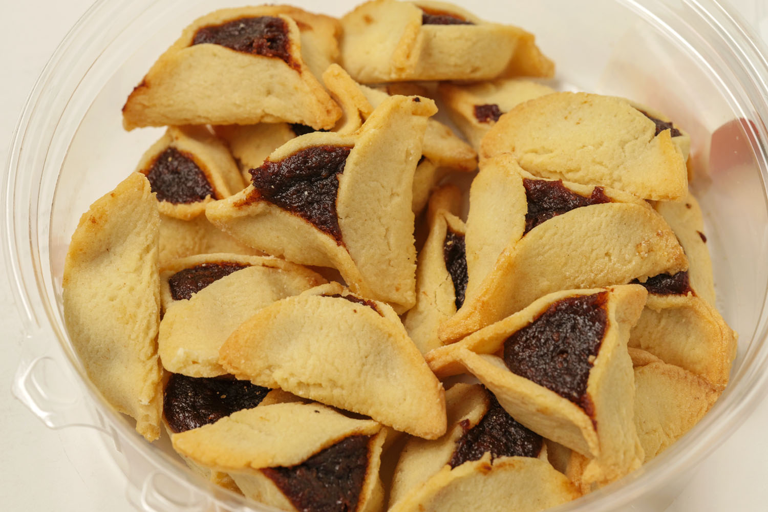 The hamantaschen are packed in a clear plastic container, a common presentation in Israeli bakeries and markets. The container keeps the cookies protected while showing their handmade shape and traditional triangular form, making them easy to serve at home or bring to holiday gatherings.