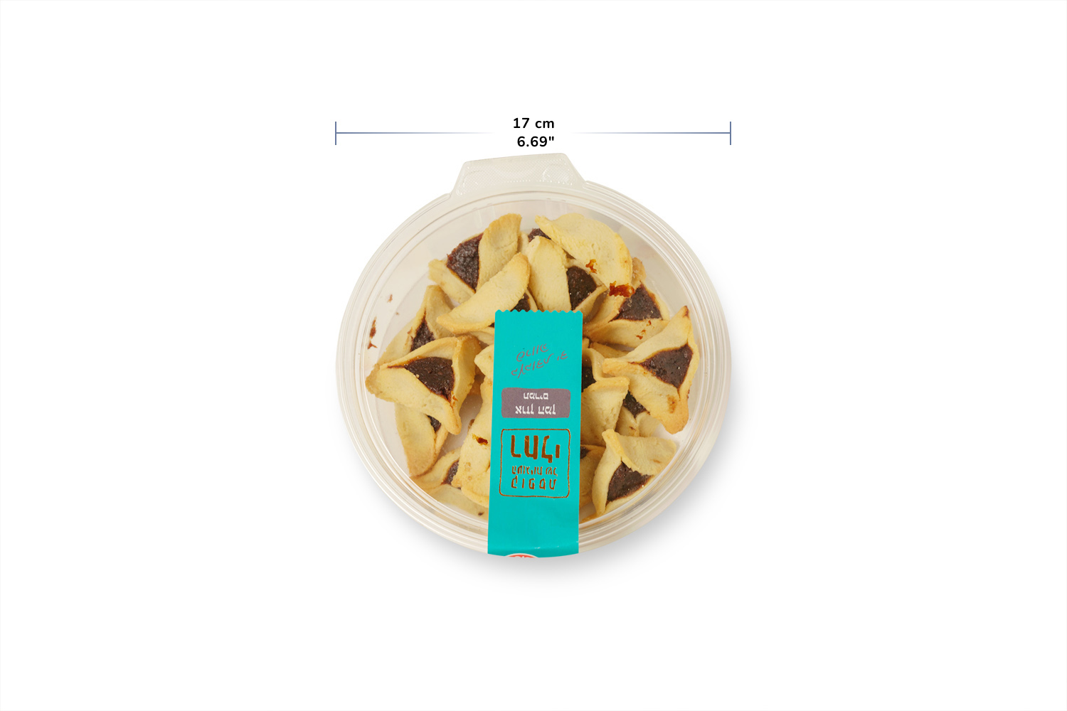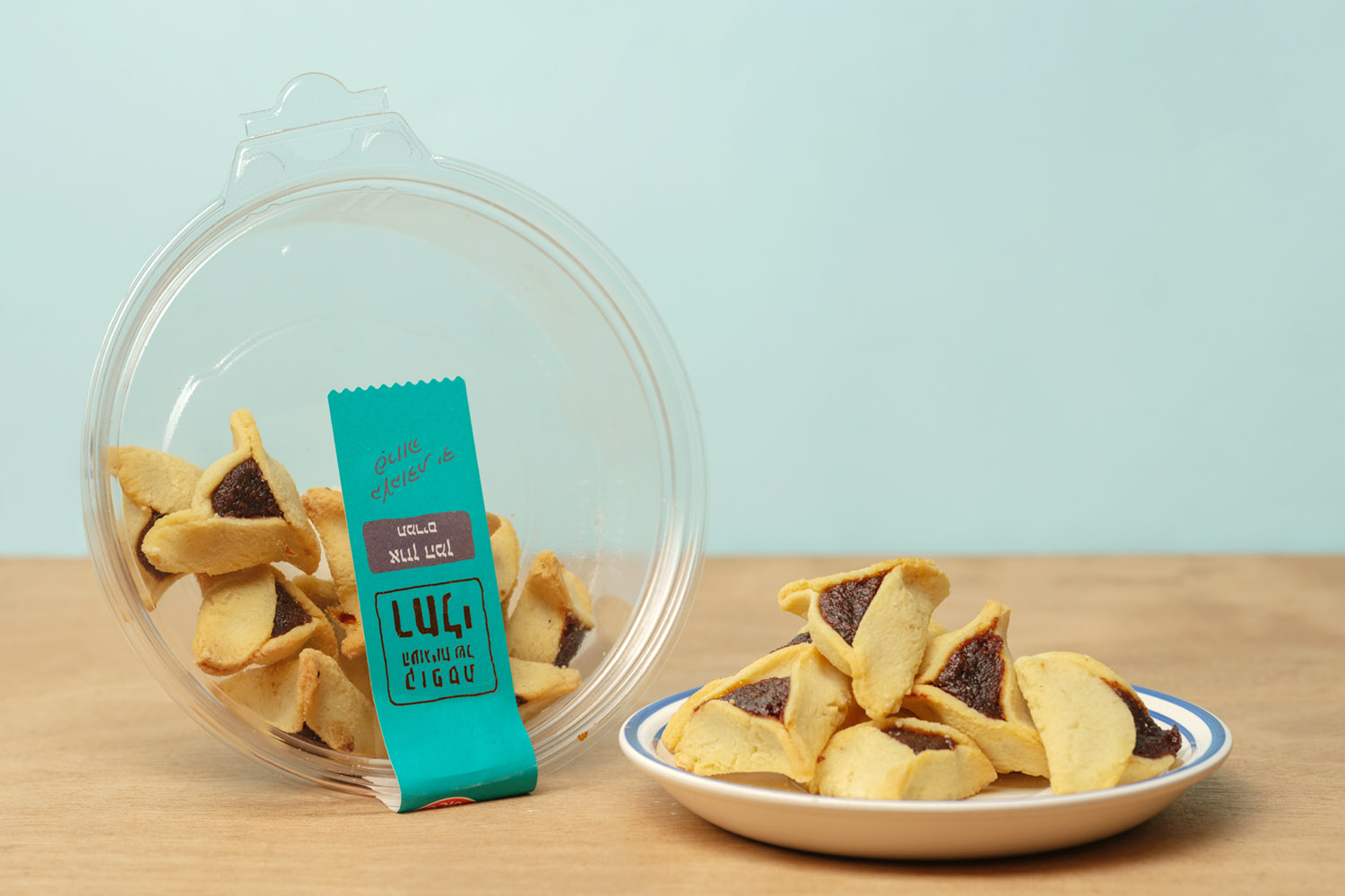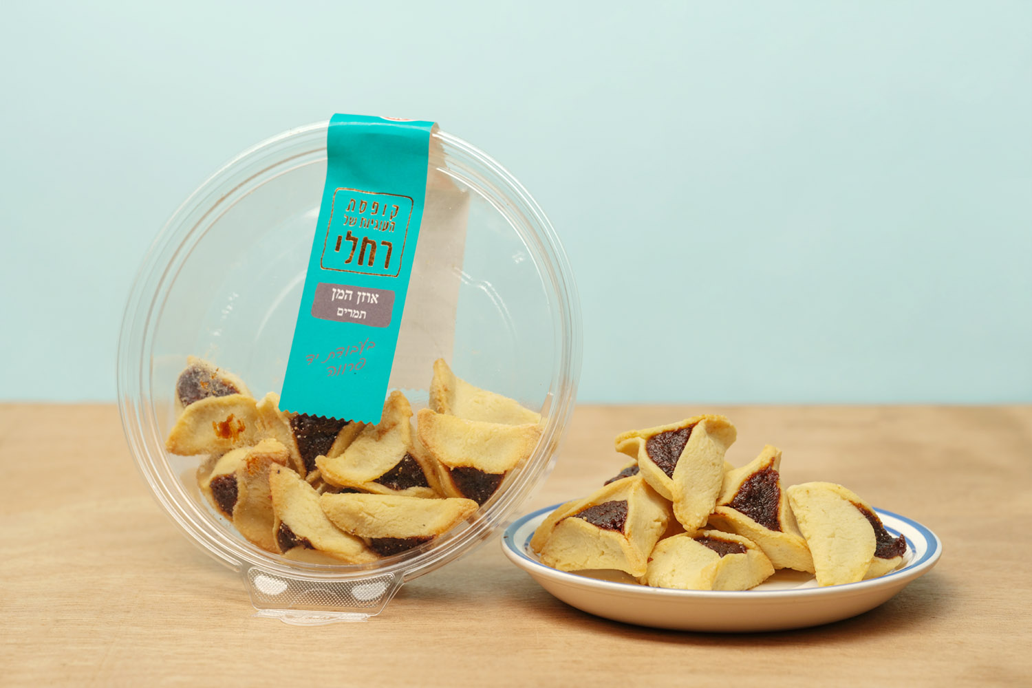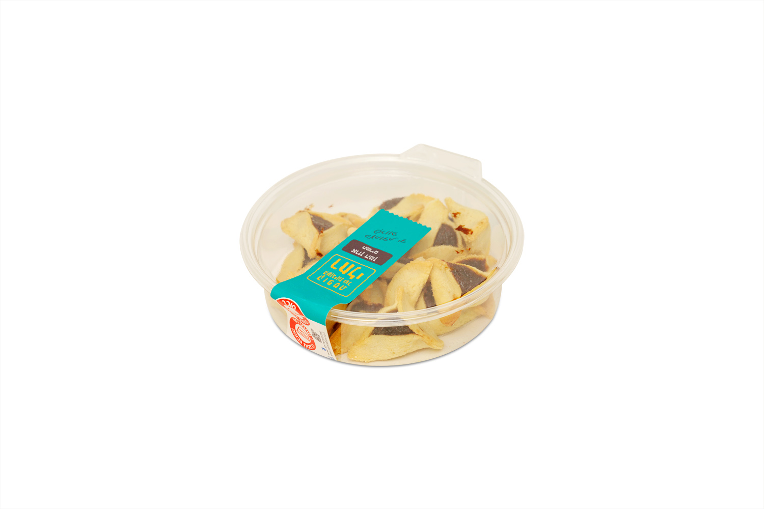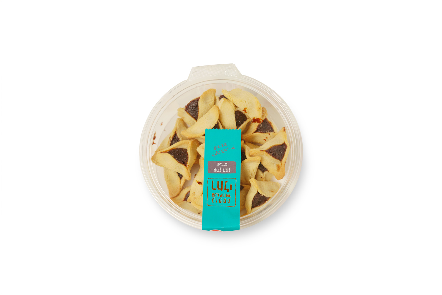 The hamantaschen are packed in a clear plastic container, a common presentation in Israeli bakeries and markets. The container keeps the cookies protected while showing their handmade shape and traditional triangular form, making them easy to serve at home or bring to holiday gatherings.