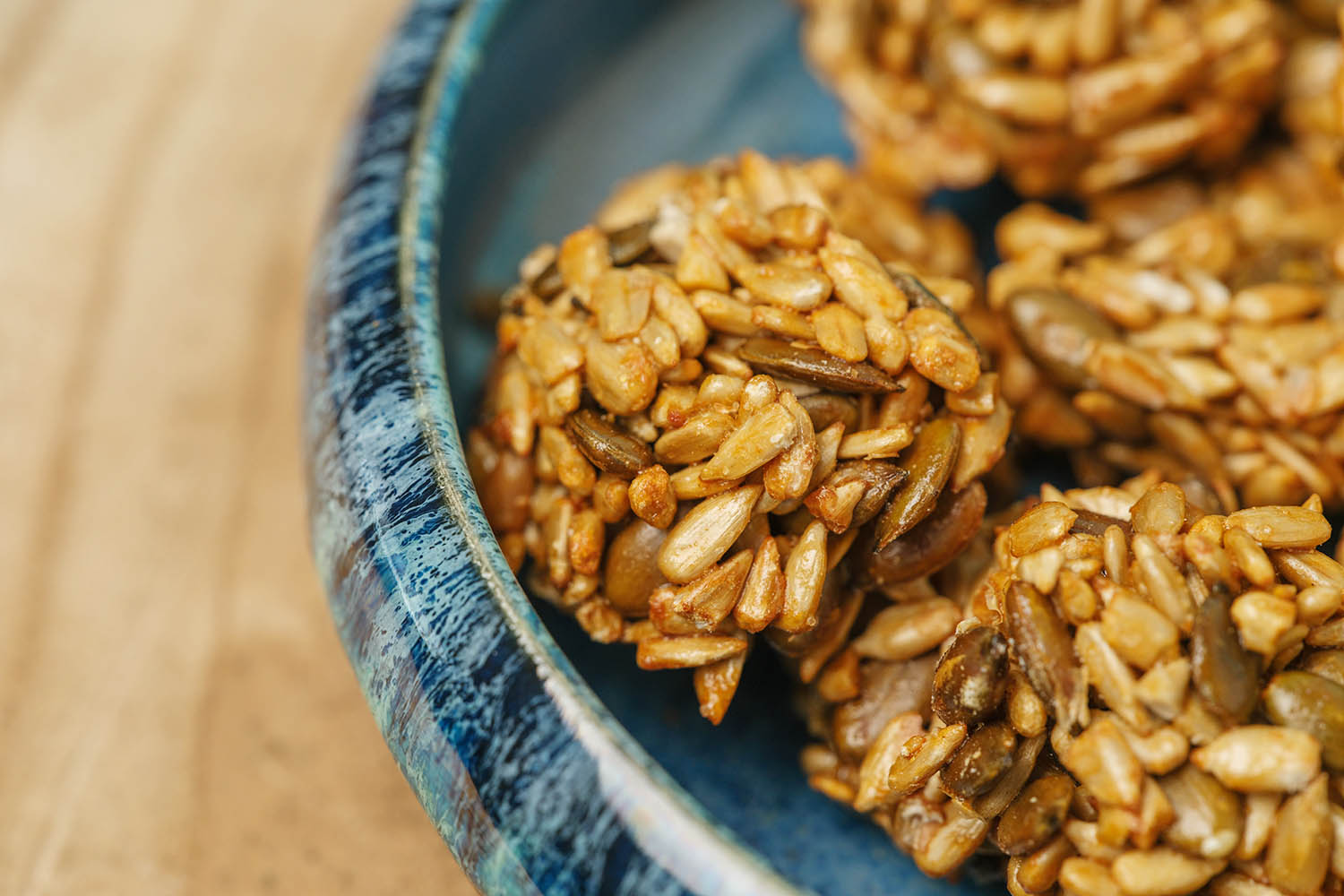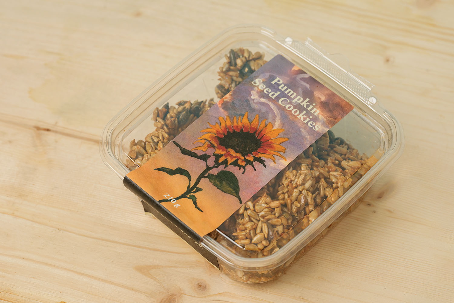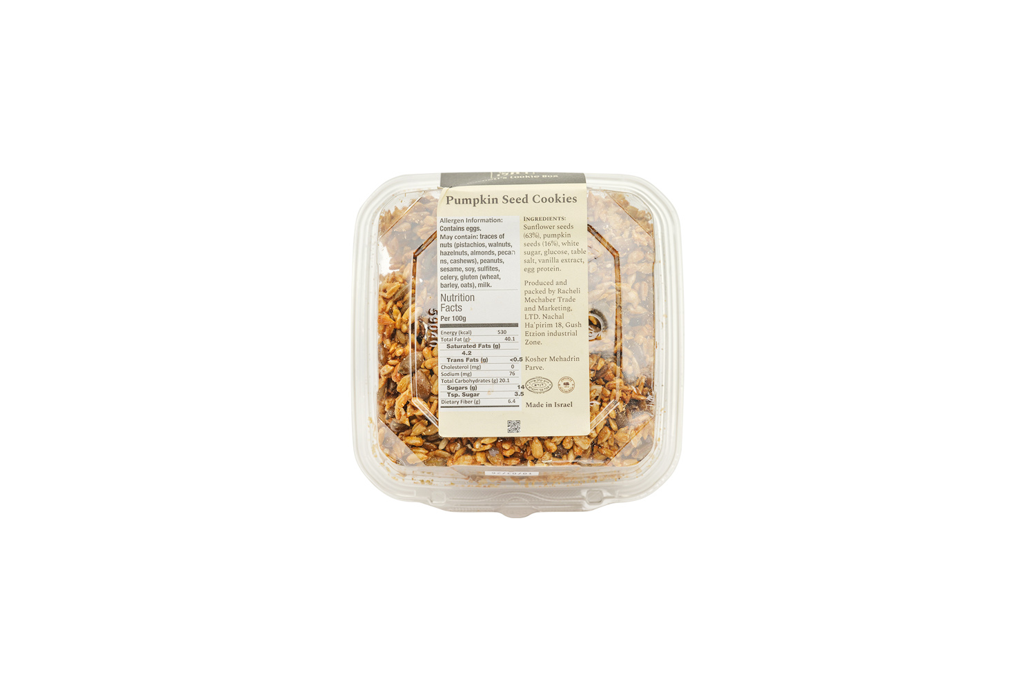 Each batch blends roasted sunflower and pumpkin seeds with sugar, egg white, and a touch of vanilla. As they bake, the seeds fuse into crisp, golden clusters that glisten in the light. The cookies cool on wide metal sheets, filling the room with a deep, nutty aroma. Each one breaks cleanly, releasing flavors that are simple and full: roasted seed, caramel, and a hint of vanilla. Racheli’s recipe reflects the rhythm of her surroundings – steady, generous, and unmistakably Israeli.