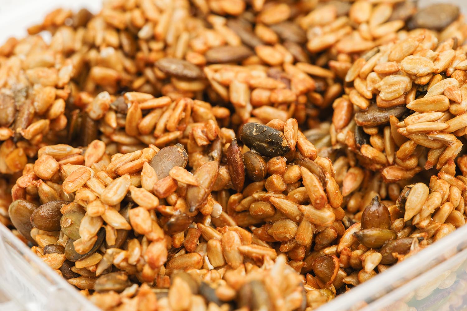 Ingredients: Sunflower seeds (63%), pumpkin seeds (16%), white sugar, glucose, table salt, vanilla extract, egg protein.