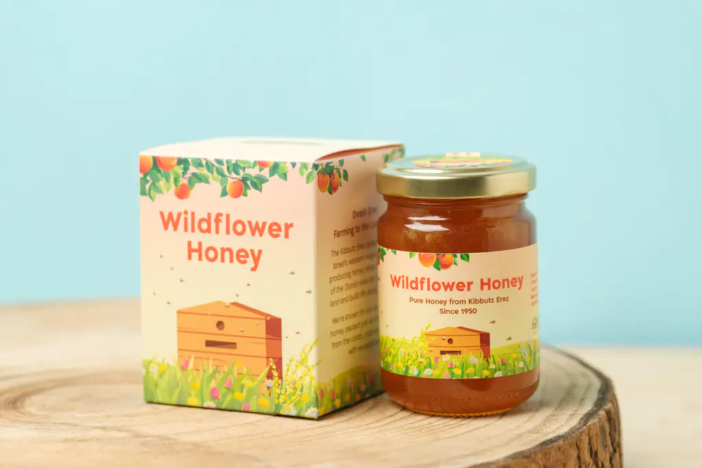 Pure, unprocessed wildflower honey from Kibbutz Erez in the western Negev — near the Gaza border. Deep amber, slow-pouring, with layers of floral sweetness and citrus. The kibbutz has kept bees since 1950. Their beekeepers returned to the hives even after October 7.