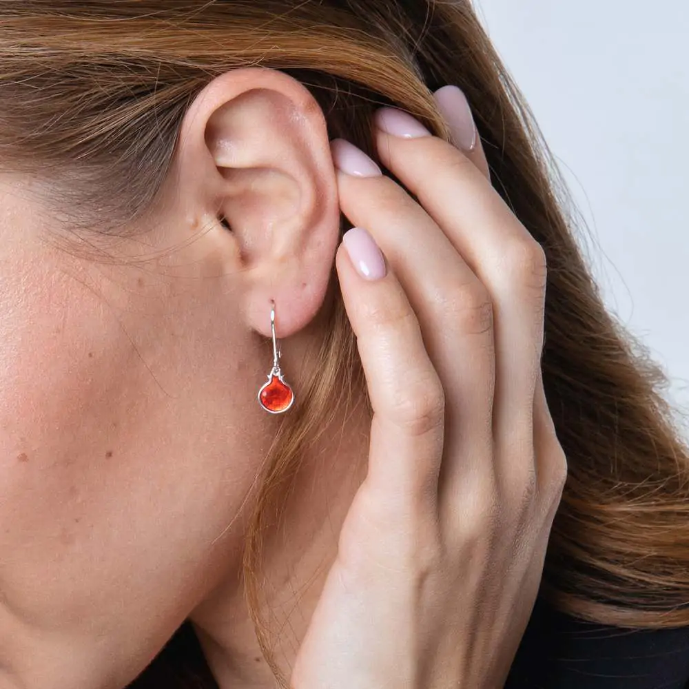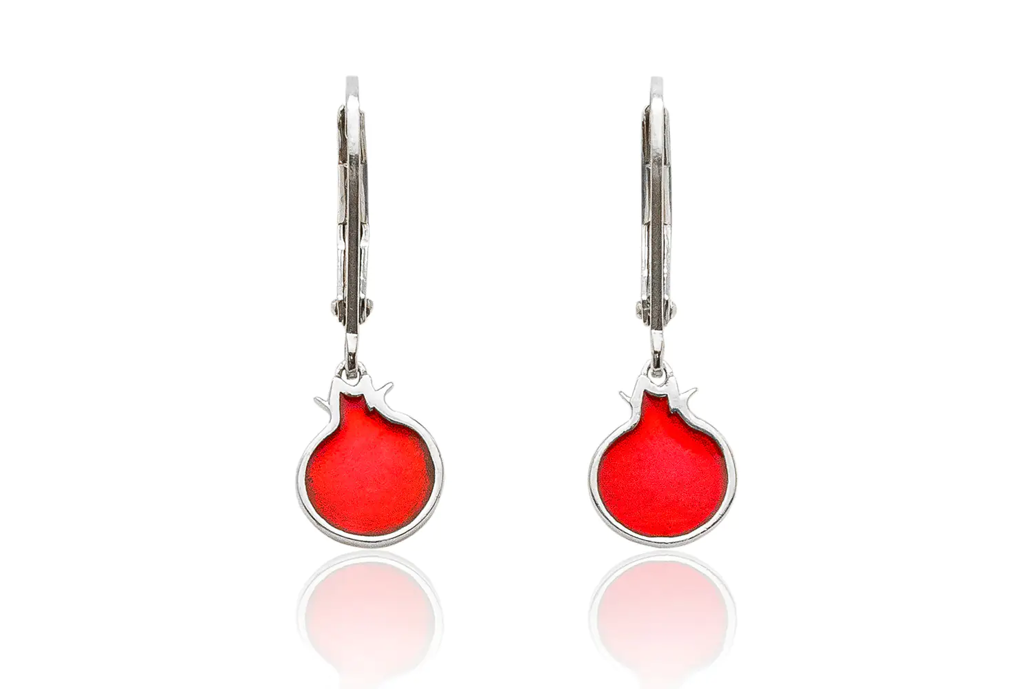 Israeli jewelry designer Marina has crafted a stunning pair of sterling silver and red enamel earrings, shaped like the juicy pomegranates of Israel! These vibrant earrings are a gorgeous statement piece, adding a pop of color to any outfit.