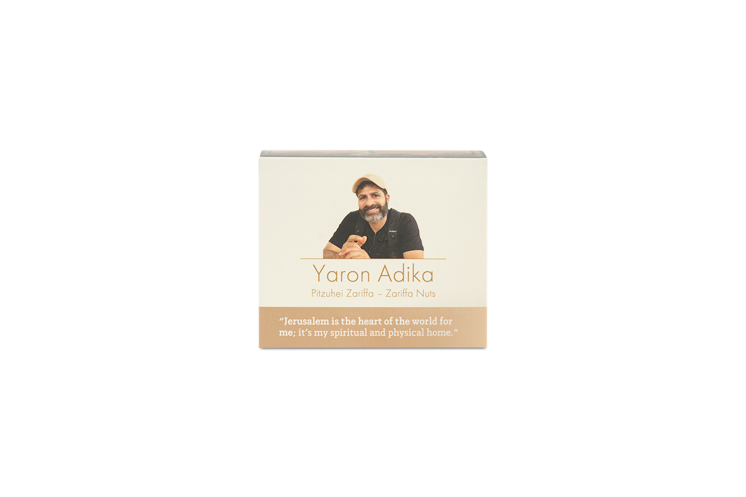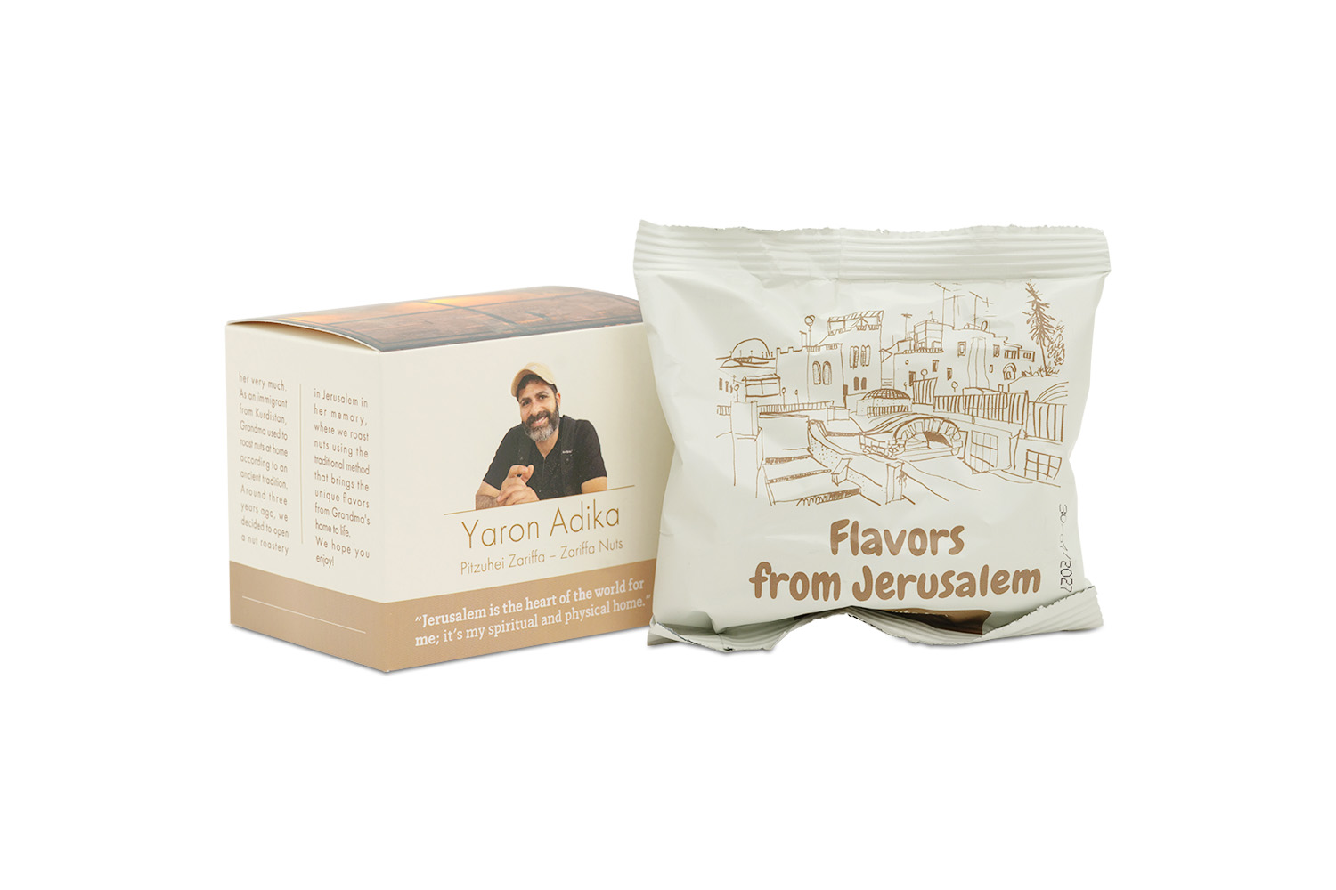 Zariffa Nuts is rooted in the Adika family’s Kurdish tradition. Yaron Adika created the roastery in memory of his grandmother, who roasted nuts at home using methods passed down through generations. She held the family together, and her kitchen was the center of every gathering. Today, Yaron continues her approach in Jerusalem, roasting nuts the way she did—slowly, patiently, and with attention to texture and aroma. The packaging carries her portrait along with a simple message: these flavors come from a home where food was made with closeness and care.