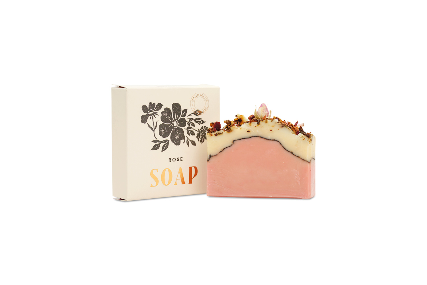 The surface of the bar is embodied with a soft rose tone, and accented with rose petals and a rose bud pressed into the top. When water is added, the soap releases a layered floral scent led by rose, followed by sweet orange, lemongrass, geranium, and ylang-ylang. Tea tree and palmarosa add depth, and provide the fragrance’s structure as it develops during use. Cocoa powder and red clay contribute to the soap’s natural color and weight, while kaolin clay adds a smooth, velvety feel to the lather.