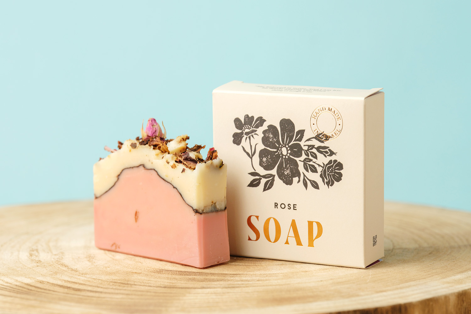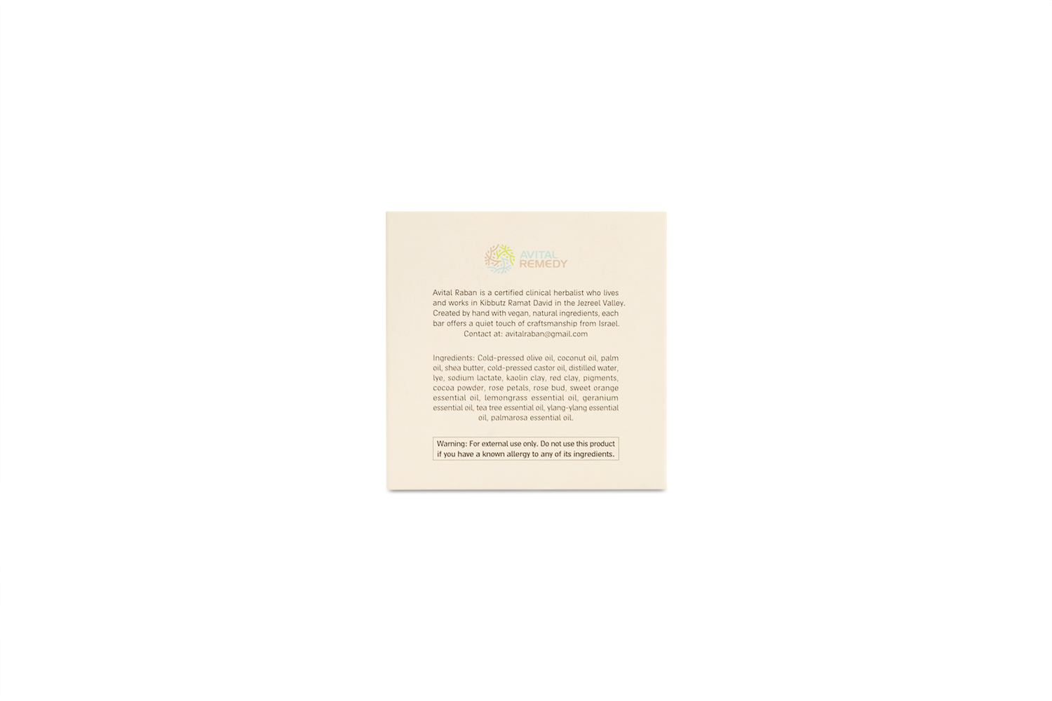 This rose soap is handmade in Israel by Avital Raban, a certified clinical herbalist who lives and works in Kibbutz Ramat David in the Jezreel Valley. Each bar is created by hand with plant based ingredients, with native botanicals and essential oils that give the soap its color, scent, and feel.