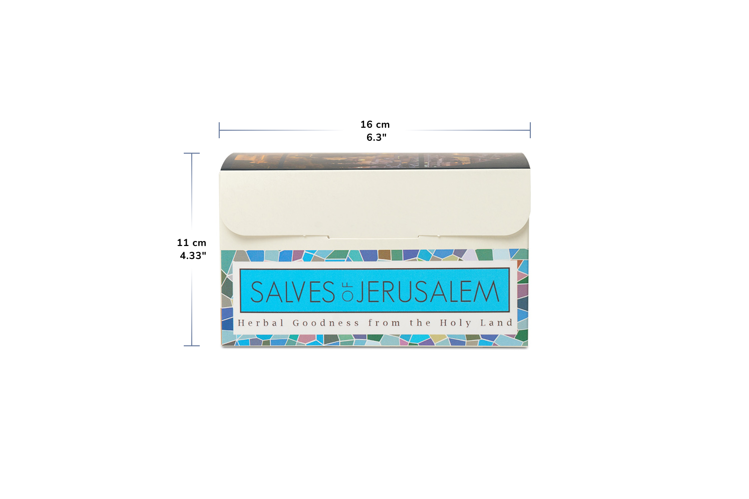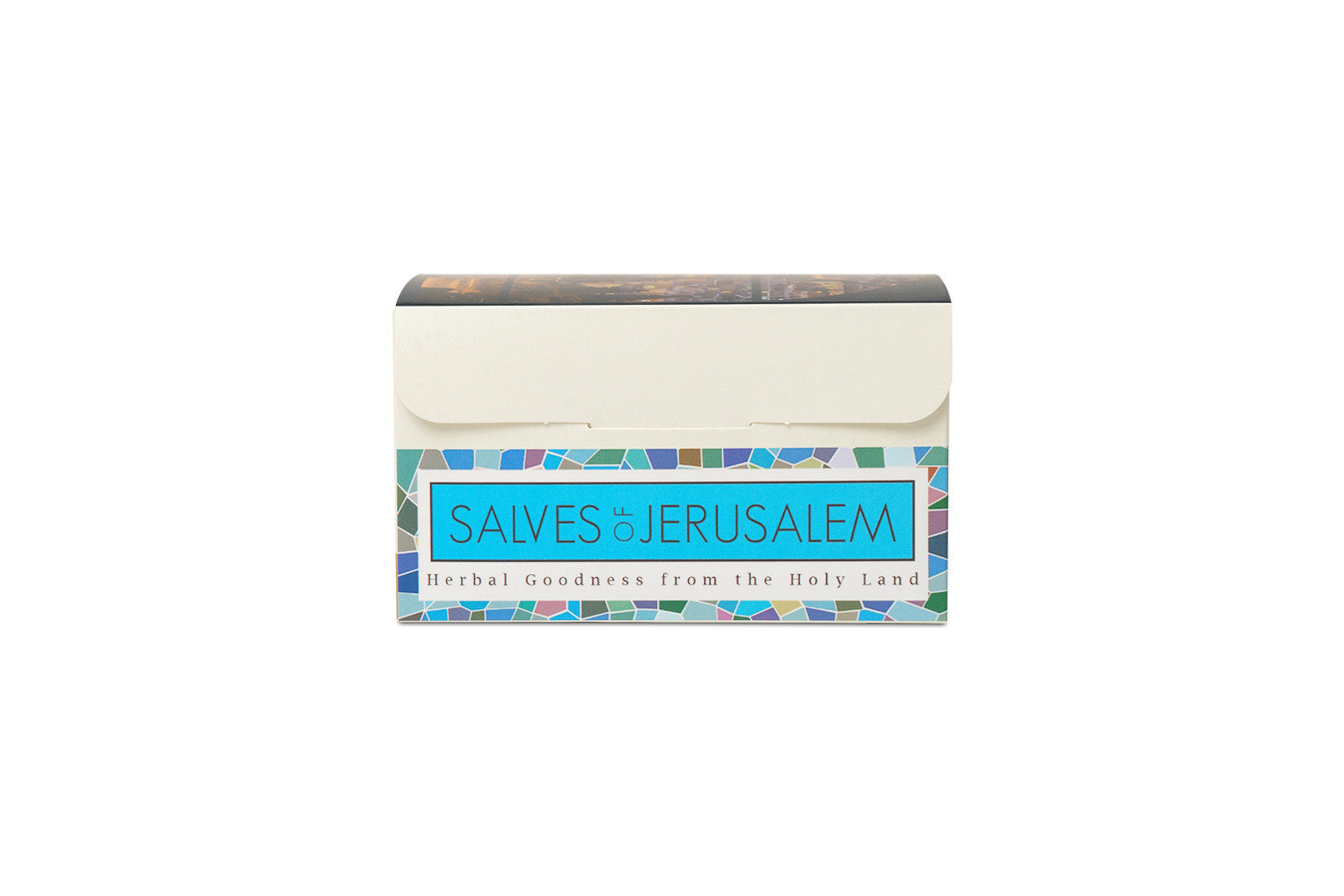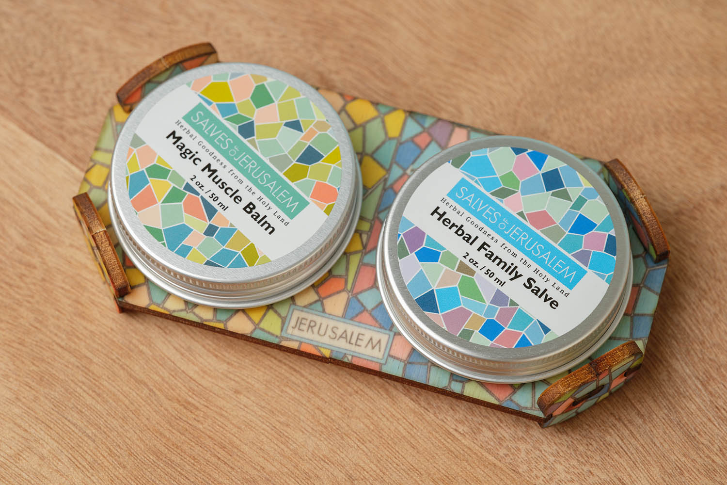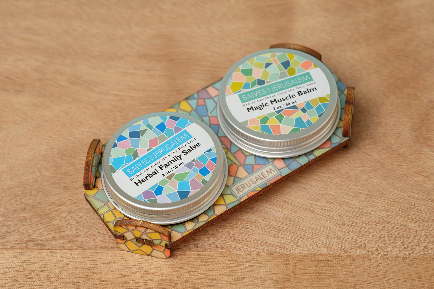 Two tins, two remedies, one heritage of healing. Resting on a mosaic tray that reflects the ancient stones of Jerusalem, the salves carry both the glow of the Old City and the touch of Simcha and Rachel Gluck, who craft them alongside their three young sons. After moving from New York to Jerusalem, the Glucks began blending wildcrafted Biblical herbs, Galilean beeswax, and organic olive oil pressed in Israel — a family passion that became Salves of Jerusalem.