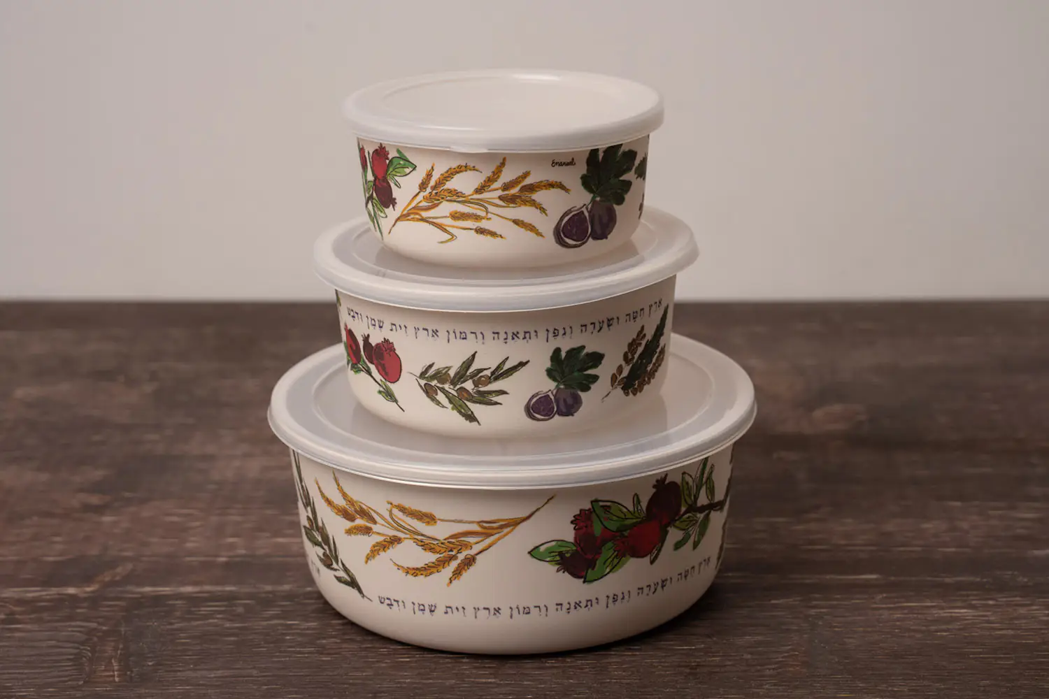 Upgrade your kitchen storage with this unique and colorful Seven Species Bamboo Storage Container Set by talented Jerusalem-based artist Yair Emanuel. These lightweight yet durable containers come in three different sizes—small, medium, and large—and feature original printed designs of the seven species of the Holy Land, along with a Hebrew inscription of the Biblical phrase from Deuteronomy that mentions the seven species.
